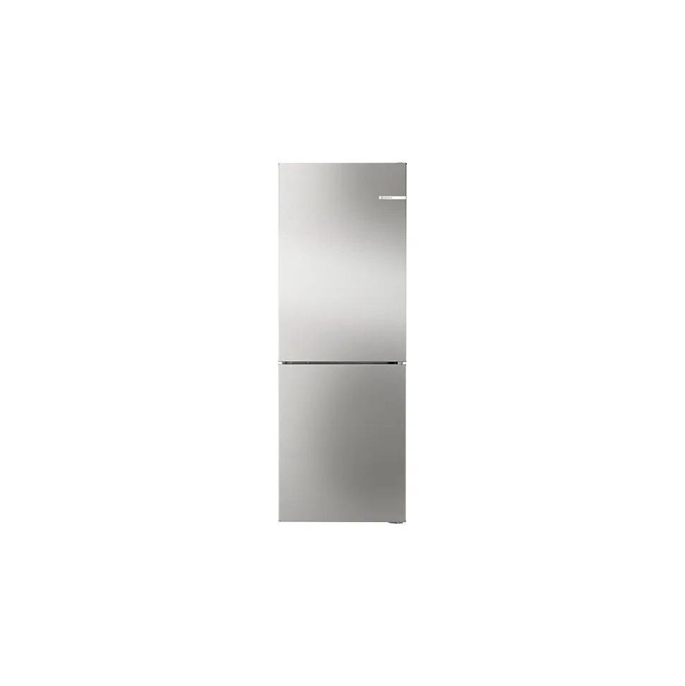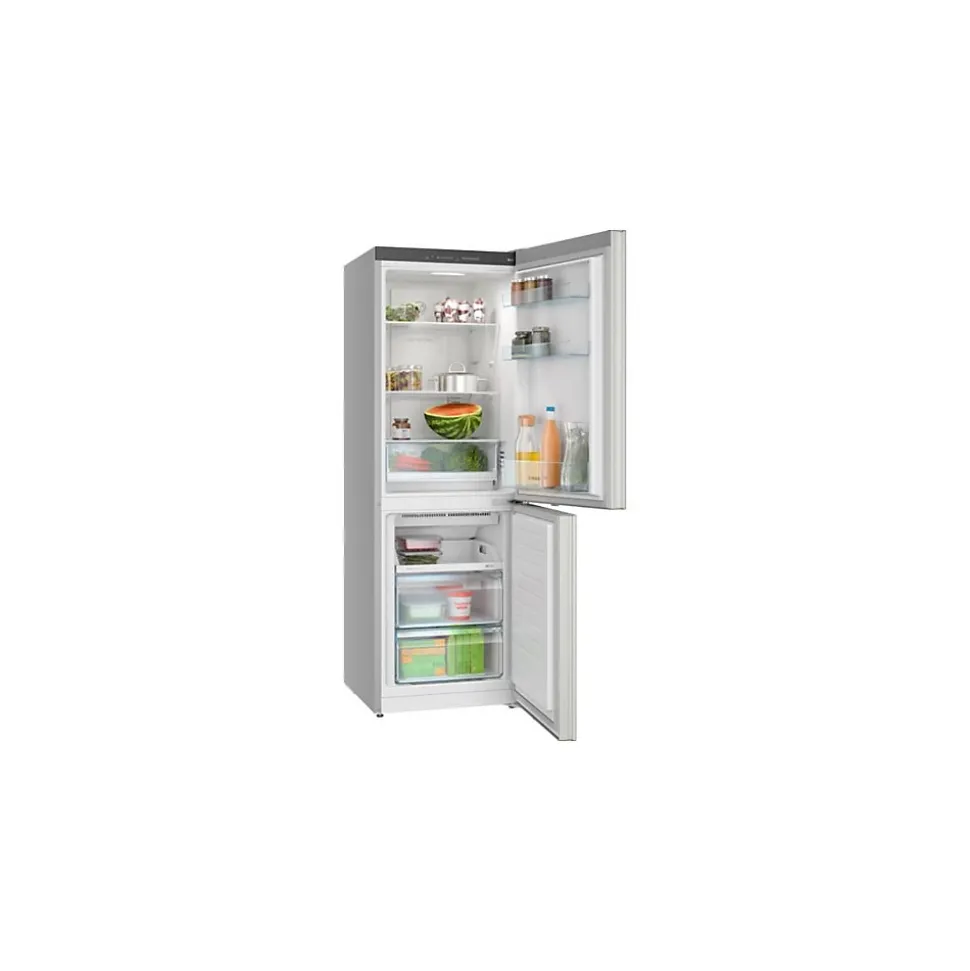 Réfrigérateur combiné Bosch KGN33NSDB – Avec une capacité totale de 279 L, il offre 189 L pour le réfrigérateur et 90 L pour le congélateur – Profitez du froid ventilé Total No Frost dans les deux compartiments pour une température homogène et sans givre – Il propose une super-congélation automatique et une régulation électronique indépendante pour chaque zone – L’équipement comprend 3 clayettes en verre (dont 2 réglables), 1 MultiBox pour les fruits et légumes, 3 balconnets, ainsi que 3 tiroirs transparents dans le congélateur – L’éclairage LED vous assure une parfaite visibilité intérieure à tout moment – La régulation est électronique avec affichage LED, et le système d’alarme visuelle et sonore vous alerte en cas de problème – Cet appareil pose-libre mesure 175,4 x 61,4 x 66,3 cm et se distingue par sa finition argent et ses poignées intégrées – Avec sa porte réversible et ses roulettes arrière, il s’adapte facilement à votre cuisine.