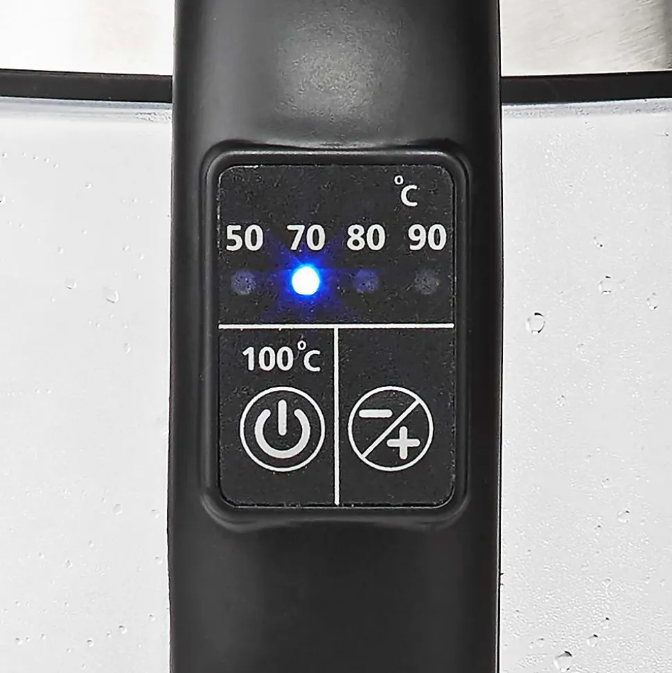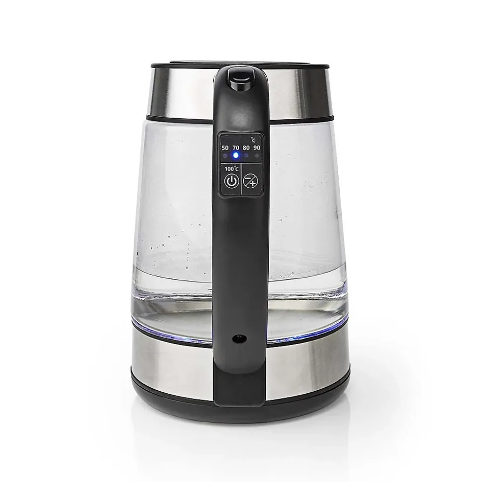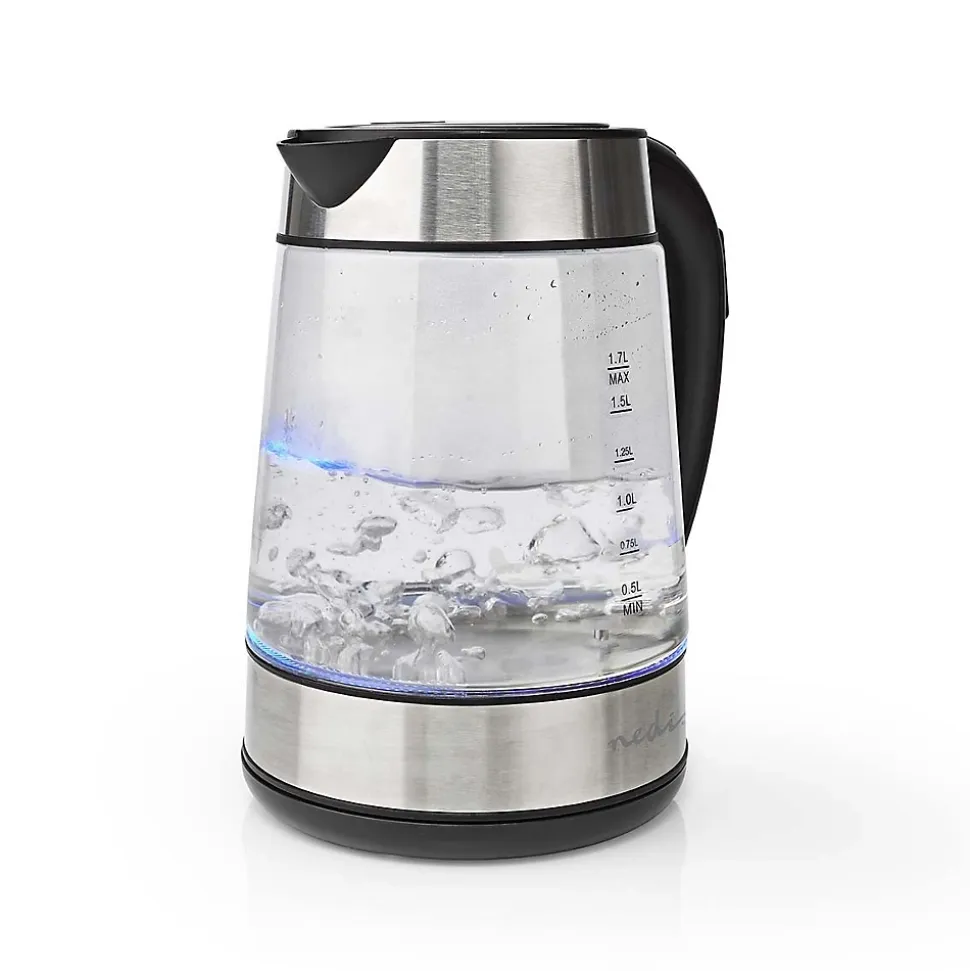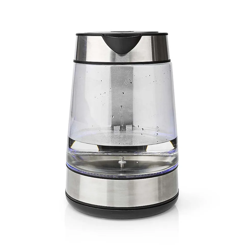 Description du produitNotre bouilloire électrique Nedis puissante et élégante offre un fonctionnement tout aussi satisfaisant que son apparence : elle a une bonne capacité de 1,7 litre. Grâce à la puissance de 2 200 W, vous pourrez préparer votre thé en un rien de temps.La LED bleue indique que la bouilloire est en cours d’utilisation et avec un boîtier en verre, vous pouvez réellement voir quand l’eau bout.Le socle pivotant à 360° sans fil garantit un levage facile.L’élément chauffant dissimulé minimise l’accumulation de calcaire et, associé au filtre amovible, cette bouilloire est très facile à nettoyer, pour garantir à tout moment le goût délicieux de vos boissons chaudes.CaractéristiquesCouvercle de sécurité : se verrouille en place et s’ouvre par pression d’une mainSocle pivotant à 360° : permet de retirer et de replacer facilement la bouilloireSans fil : pour un remplissage et un versement facilesIndicateur de niveau d’eau des deux côtés : pratique pour les gauchers et les droitiersFiltre amovible : facile à rincercapacité de 1,7 litreBoîtier en verre avec des touches en acier inoxydable : élégant et résistantArrêt automatique et protection contre l’ébullition à sec : pour votre sécuritéLED bleue : indique quand la bouilloire est en cours d’utilisationContenu de l’emballageBouilloire électriqueGuide de démarrage rapideSpécificationsAffichage de la température: NumériqueConsommation électrique maximale: 2200 WContrôleur Strix: OuiCouleur: TransparentÉclairage LED: OuiÉlément chauffant dissimulé: OuiEspace de rangement du cordon: OuiFiche d’alimentation: Type F (CEE 7/7)Filtre en calcai