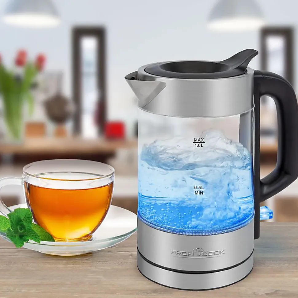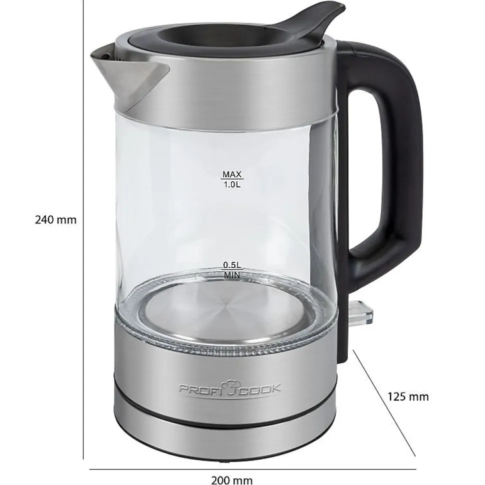 Bouilloire pratique de 0,5 litre en verreMoins d’espace requis et réduit la consommation d’eau inutileBoîtier en verre/acier inoxydableStation de base avec rangement du cordon (gainé d’acier inoxydable) Capacité jusqu’à 0,5 litreUtilisation d’une seule main – ouverture de remplissage à fermeture automatique dans le couvercleManipulation aisée grâce à la technologie sans câble et au connecteur à 360 degrésInterrupteur marche/arrêt (éclairage bleu)Réservoir d’eau (illuminé en bleu)Sans BPAÉlément chauffant en acier inoxydable dissimuléArrêt automatique et manuelIndicateur de niveau d’eauRéservoir d’eau en verre de sécurité résistant à la chaleurProtection contre l’évaporation et la surchauffe220-240 V, 50-60 Hz, 900-1100 W