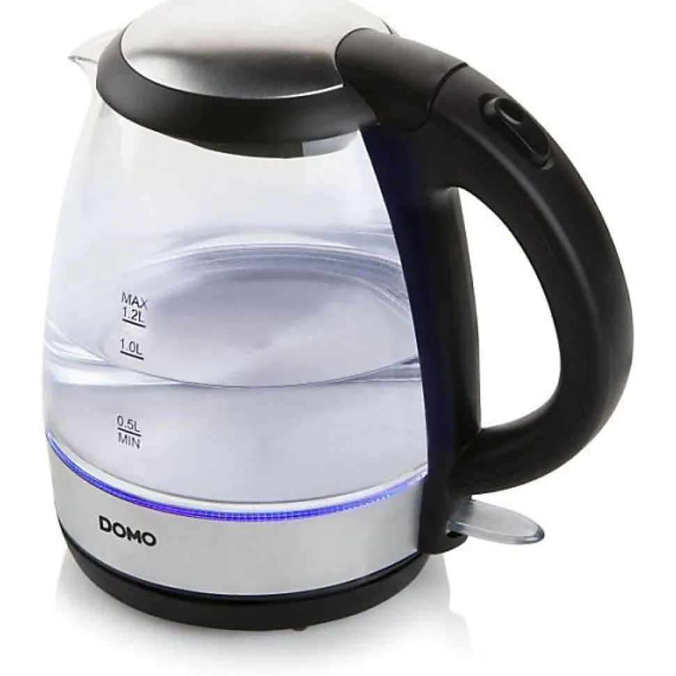 Bouilloire en verre DOMO 1,2 L 2200 W avec socle 360°, éclairage bleu, arrêt automatique et protection anti chauffe à sec ; carafe en verre et couvercle inox.