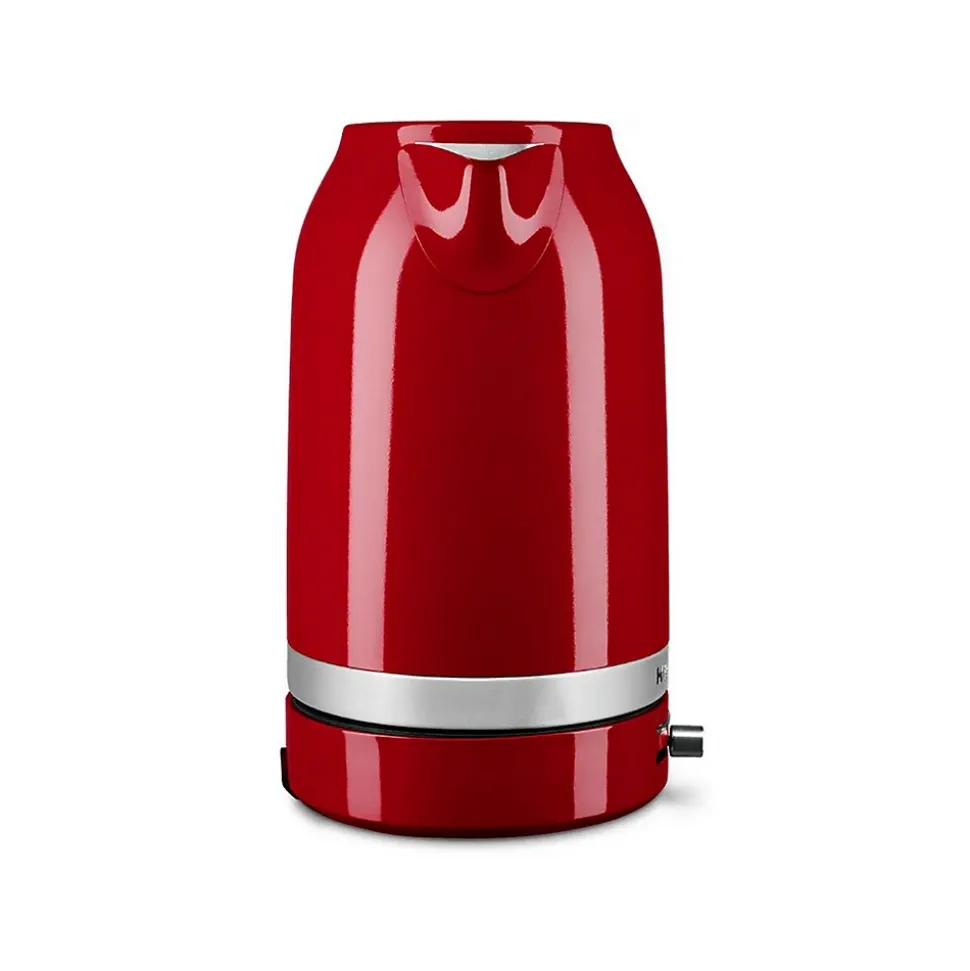 Bouilloire sans fil 1.7l 2400w rouge flamboyant Kitchenaid – Bouilloire à température 5KEK1701EER/1 de Kitchenaid.Bouilloire à température variable d’une capacité de 1.7 L avec intérieur en acier inoxydable brossé : Fait bouillir l’eau rapidement pour préparer plusieurs tasses de thé, café, céréales, et bien plus encore.Contrôle variable de la température : Chauffe rapidement et silencieusement l’eau à la température souhaitée, de 50 à 100° C.Technologie de chauffe automatique : Fait bouillir l’eau et s’arrête automatiquement une fois l’ébullition atteinte.Conception monobloc en acier inoxydable et bec verseur anti-gouttes de qualit supérieure.Résistante, stable et facile à utiliser.Versement rapide et maîtrisé.Filtre anticalcaire amovible et lavable, rotation à 360° sur la base pivotante et couvercle à charnière avec bouton-poussoir.Grande facilité de nettoyage et de déplacement de la bouilloire.Pour remplir rapidement et facilement la bouilloire d’eau, sans en mettre partout.Jauge de niveau d’eau : Assure un remplissage parfaitPour toujours chauffer la bonne quantité d’eau. – Type de produit : Bouilloire.Capacité : 2000 – 2400 W.Tension : 220 – 240 V.Fréquence : 50/60 Hz.Réglage : Électronique.Capacité de la bouilloire : 1.7 L.Matériau : Acier inoxydable.Plage de températures : 50 à 100 °C.Longueur du cordon : 71 cm.Paroi unique : Oui.Anneau indiquant que c’est prêt : Oui.Son indiquant que c’est prêt : Oui.Fonctionnement sans fil avec rotation à 360° sur le socle : Oui.Filtre anticalcaire amovible : Oui.Couvercle avec bouton-poussoir : Oui.Bouton marche/arrêt : Oui.Arrêt en cas de chauffage à sec : Oui.Visualisation du niveau d’eau : Oui.Source d’alimentation : Secteur.Indications à l’intérieur : Non.Paliers de température de 10 °C : e 50 à 100 °C.Couleur : Rouge.Finition /