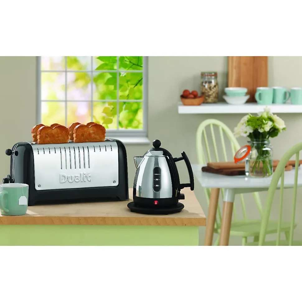 Bouilloire sans fil 1l 2000w Dualit – La bouilloire sans fil 1L 72220 est parfait pour un usage domestique, avec tous les avantages de la bouilloire de 1,5 litre , mais sur une plus petite échelle. La même grande fenêtre de visualisation des deux côtés dispose d’indicateurs de niveau de tasse de sorte que vous ne faites bouillir que la quantité d’eau que vous avez réellement besoin (minimum 2 tasses).La bouilloire possède un grand couvercle permettant un remplissage facile. – Puissance : 2000 WCapacité : 1 LRésistance cachéeProductivité 15 L par heureEbullition rapideSécurité ébullition à secFiltre à eauNiveau d’eau visibleRotation sur axePoignée isolanteIndicateur de tassesCorps en acier inoxydableDimensions : 20 x 16 x 21 cmPoids : 0,9 kgCouleur : Inox et noir
