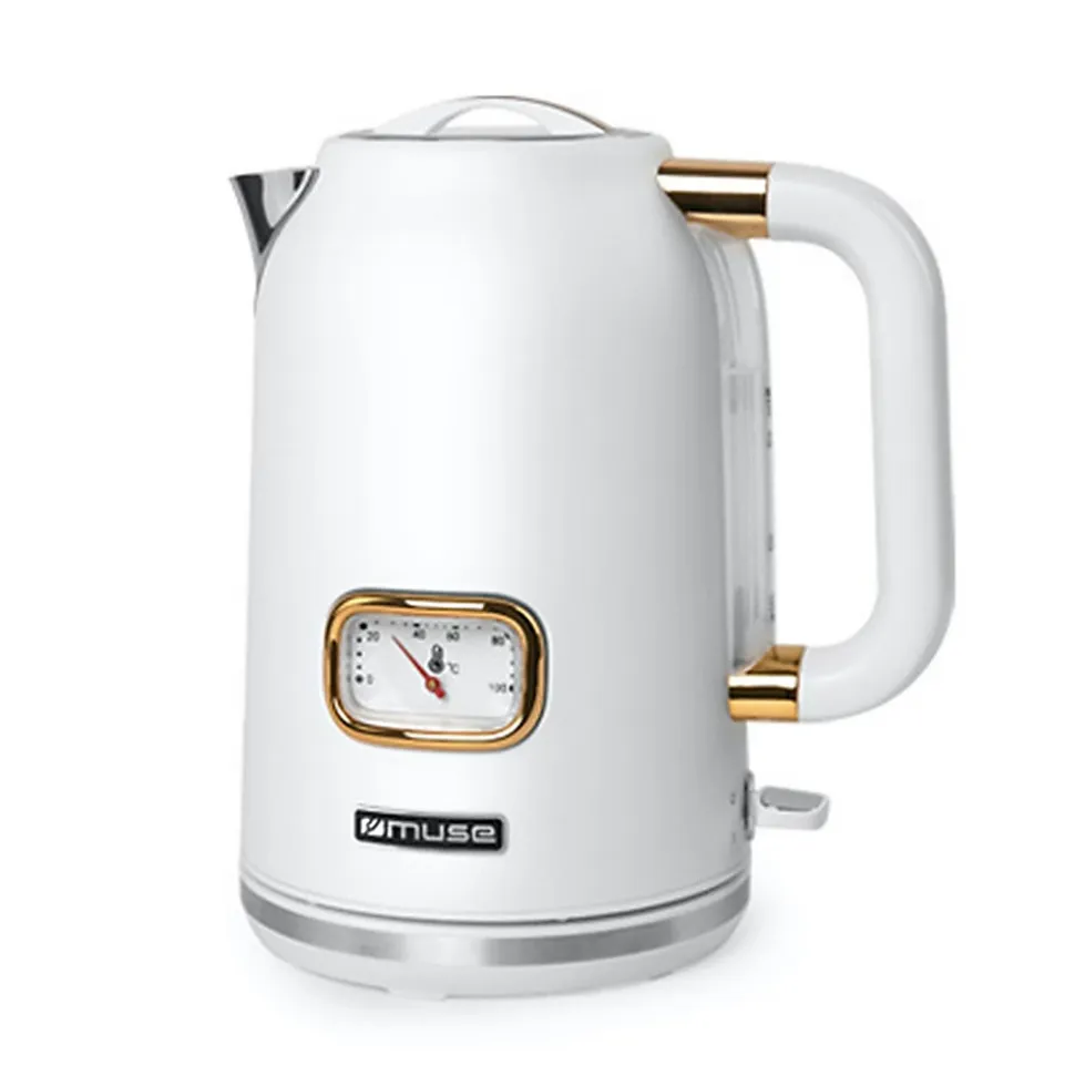 Bouilloire sans fil MUSE MS-030 W avec indicateur de température de l’eau – 2200W – Filtre amovible et lavable – Capacité de 1.7 L. Cette bouilloire fonctionnelle et design d’une puissance de 2200 W fera bouillir un 1,7L d’eau en un tour de main !CARACTÉRISTIQUES :- Indicateur de température de l’eau- Filtre amovible et lavable- Bec en V pour verser et remplir facilement- Capacité de 1.7 L avec indicateur de niveau- Corps en acier inoxydable 304- Interrupteur lumineux- Enrouleur de cordon- Arrêt automatique- Base pivotante à 360 degrésPUISSANCE :- 2200WALIMENTATION :- 220-240V, 50/60HzPRODUIT :- 252 mm (H) x 154 mm (P) x 219 mm (L)- Poids net: 1.08 kgEMBALLAGE :- 250 mm (H) x 200 mm (P) x 220 mm (L)- Poids brut: 1.36 kg…