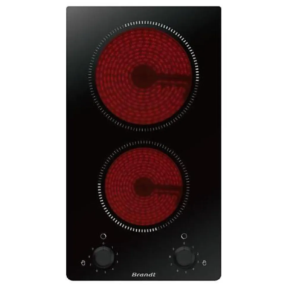Plaque vitrocéramique Brandt 3000W, modèle BPV 6210 B, avec 2 foyers, design compact 30 cm, manettes frontales à 9 positions, technologie Radiant Quicklight, sécurité avancée avec témoins et protection automatique, surface facile à nettoyer.