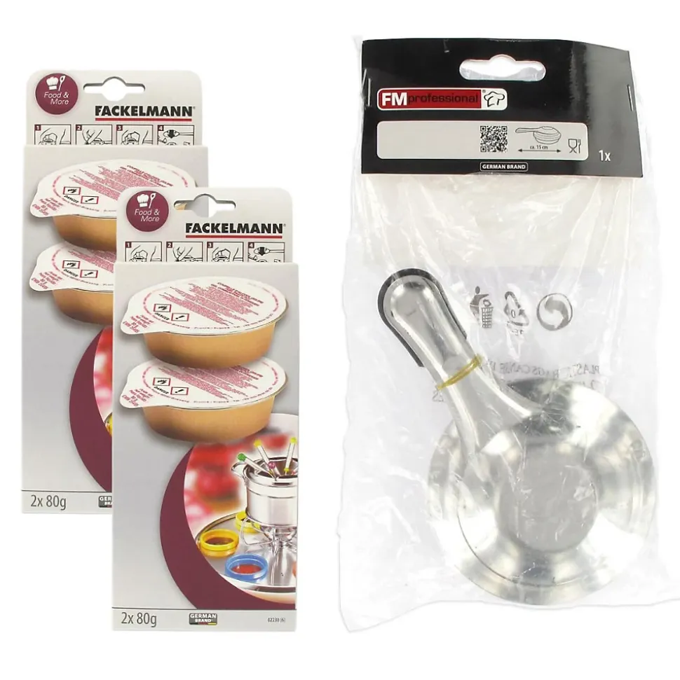 - DESCRIPTION : Fackelmann vous propose cet ensemble contenant un brûleur à alcool et 4 coupelles d’alcool gélifié, idéal pour les fondues savoyardes, bourguignonnes, vigneronnes