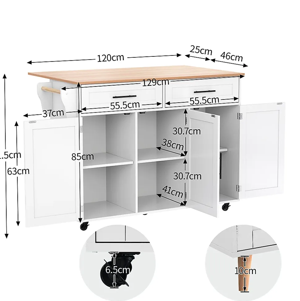 - 6. Îlot de rangement fixe : cet îlot de cuisine est également équipé de quatre pieds en bois massif et d’une plaque de support centrale. Si vous n’avez pas besoin de déplacer ce meuble, vous pouvez remplacer les roulettes par des pieds.
