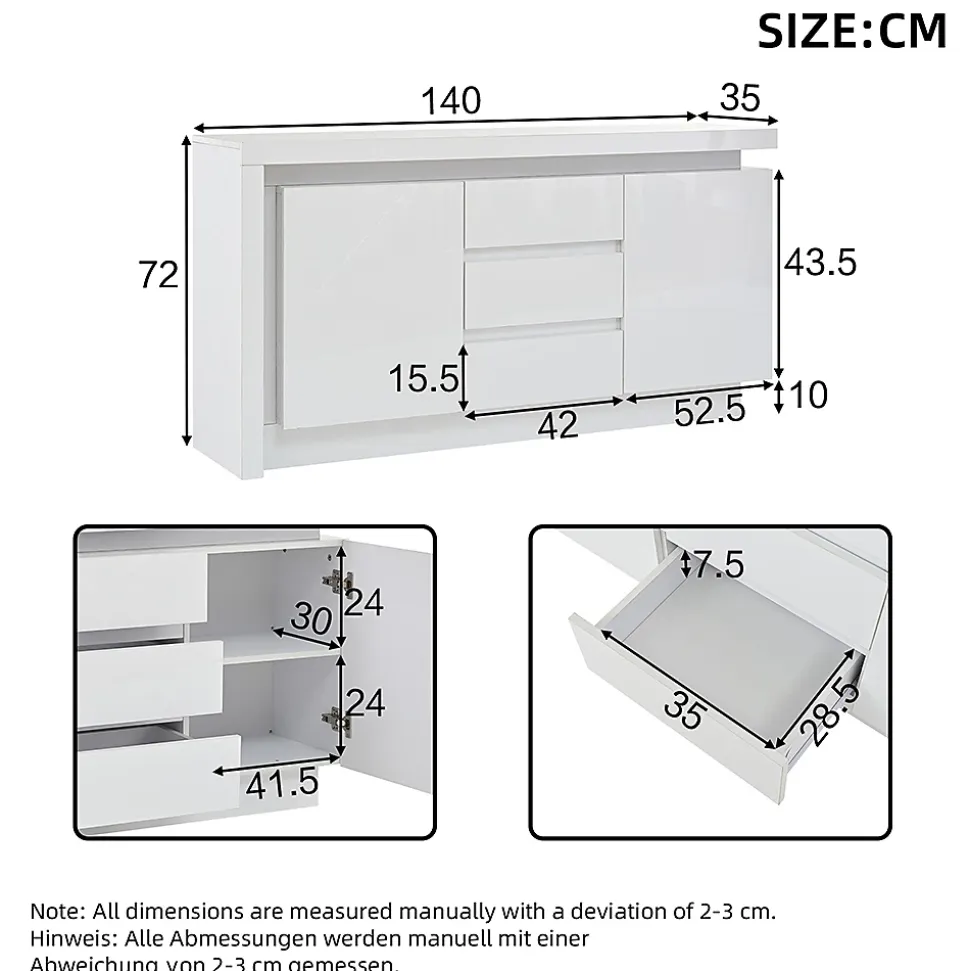 Caractéristiques du produitDimensions du colisSous-article 1 : 62,48 * 53,34 * 22,48 cm 26,4 kgSous-article 2 : 149,86 * 43,18 * 13,34 cm 26,5 kgDétailsCouleur principale : BlancMatériau principal : Panneau de particulesGrandes dimensions 140*35*72 cmPoids brut/net 52,9/47,7Dimensions de l’emballage 149,86*43,18*13,34 cm + 62,48*53,34*22,48 cmCapacité de poids 40 kgCouleur BlancMatériau Panneau de particulesPosition de mise en évidence Avant et dessus uniquementLED OuiTablette réglable OuiNombre de portes 2Nombre de tiroirs 3Arguments de vente pour les produits 2 armoires/3 tiroirs/LED/surface brillante/cloisons réglablesRemarque : en raison des conditions de prise de vue et des appareils d’affichage, il peut y avoir de légères différences de couleur entre le produit réel et l’image. Ceci est normal et ne constitue pas un problème de qualité. Nous nous efforçons de reproduire les couleurs réelles du produit. Veuillez donc passer votre commande avec soin.