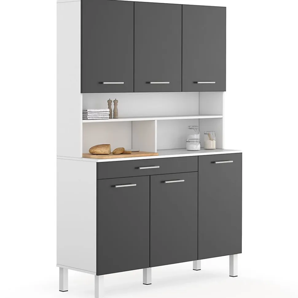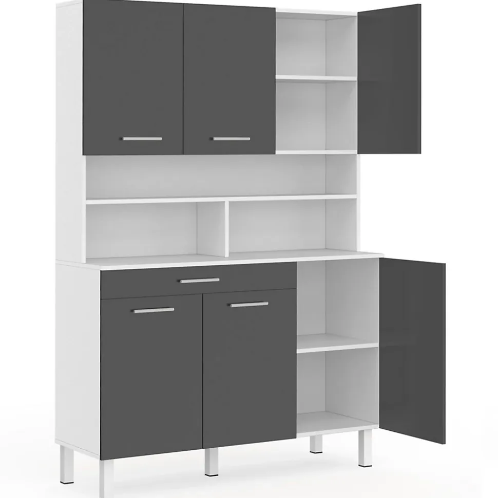 Profitez sans plus attendre du buffet de cuisine CINA blanc et gris à la fois pratique et esthétique ! Avec ses 6 placards et son tiroir, vous bénéficiez d’un espace de rangement XXL fermé.Utilisez les 3 placards du bas de la structure pour stocker vos assiettes, poêles, casseroles et autres ustensiles de cuisine. Hyper pratique, vous pouvez utiliser le tiroir L.80xH.10 cm pour organiser le rangement de vos couverts ainsi que de vos louches, fouets, couteaux de cuisine, etc.Le placard bas de droite est isolé du reste de la structure, quoi de mieux pour ranger vos assiettes et vos verres sans craindre de casse. Chaque placard est muni d’une étagère afin d’augmenter la capacité de stockage.Un large plan de travail blanc vient recouvrir l’entièreté de la structure basse du meuble de cuisine. Avec ses 83 cm de hauteur, il vous offre la possibilité de travailler dessus, mais pas seulement ! Avec ses deux niches et son étagère apparente de 22 cm de profondeur, gardez vos épices à portée de main !Le haut du buffet CINA est composé de 3 placards identiques. Profonds de 21.7 cm ses 3 placards sont faits pour accueillir vos aliments ou vos verres les plus fragiles. À vous de choisir, dissociez le placard de droite des deux de gauche ou utilisez les 3 pour stocker votre farine, riz et conserves. Avec son look moderne blanc et ses façades grises brillantes, votre nouveau buffet de cuisine CINA s’accordera parfaitement avec le restant de vos éléments de cuisine. N’hésitez-plus et profitez dès maintenant du meuble de cuisine pratique et esthétique !Dimensions du buffet de cuisine CINA 120 CMDimensions hors tout : Longueur 120 cm x largeur 40 cm x Hauteur 177 cmDimensions du placard bas de gauche : L.77 x l.36,5 x H.52.5 cm – Etagère H.31.5 cmDimensions du placard bas de droite : L.38 x l.36,5 x H.63.4 cm – Etagère H.31.7 cmDimensions du tiroir : façade L.80 x H.10 cm Hauteur du plan de travail : 83 cmDimensions des deux niches : L.57,7 x l.21.7 x H.18 cmDimensions de la niche sup