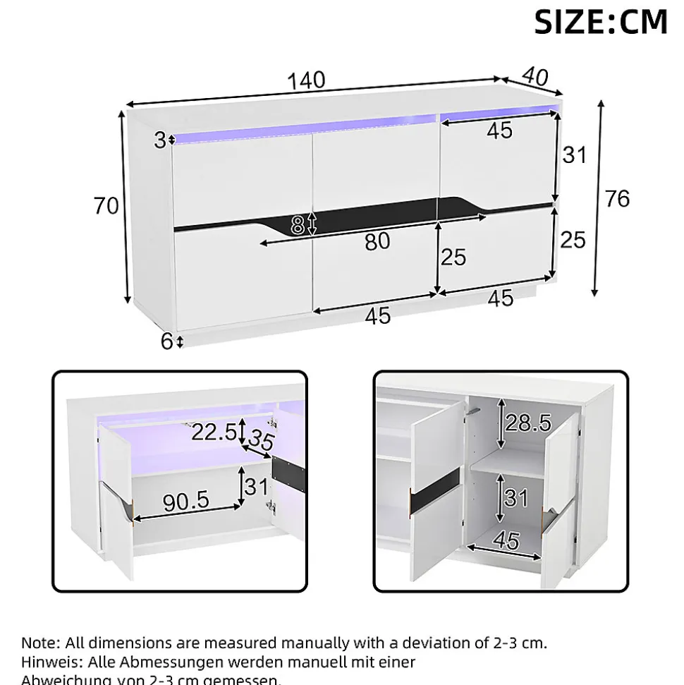 Caractéristiques du produitDimensions du produitLongueur assemblé (cm) : 140,00Largeur assemblé (cm) : 40,00Hauteur assemblé (cm) : 76,00Poids du produit (kg) : Non applicableDimensions du colisSous-article 1 : 71,76 * 50,17 * 17,78 cm 19,2 kgSous-article 2 : 150,5 * 49,53 * 10,8 cm 23,75 kgDétailsCouleur principale : BlancMatériau principal : Panneau de particulesGrandes dimensions 140 x 40 x 76 cmPoids brut/net 42,95 kg/38,3 kgDimensions de l’emballage 150,5*49,53*10,8 cm + 71,76*50,17*17,78 cmCapacité de charge 40 kgCouleur Blanc + noirMatériau Panneau de particulesPosition de l’éclairage Seule la partie blanche à l’avantLED OuiTablette réglable OuiNombre de portes 3Arguments de vente pour les produits 3 portes/5 tablettes réglables/LED/surface du boîtier brillanteRemarque En raison des différentes conditions de prise de vue et des différents appareils d’affichage, il peut y avoir de légères différences de couleur entre le produit réel et l’image. Ceci est normal et ne constitue pas un problème de qualité. Nous nous efforçons de reproduire les couleurs réelles du produit. Veuillez donc passer votre commande avec soin.Alimentation via USB Livré avec un câble USB 5 V 2 A (connecteur USB non inclus) qui peut être branché sur votre téléviseur, votre ordinateur, votre batterie externe, etc. Utilisation sûre et simple à l’intérieur.