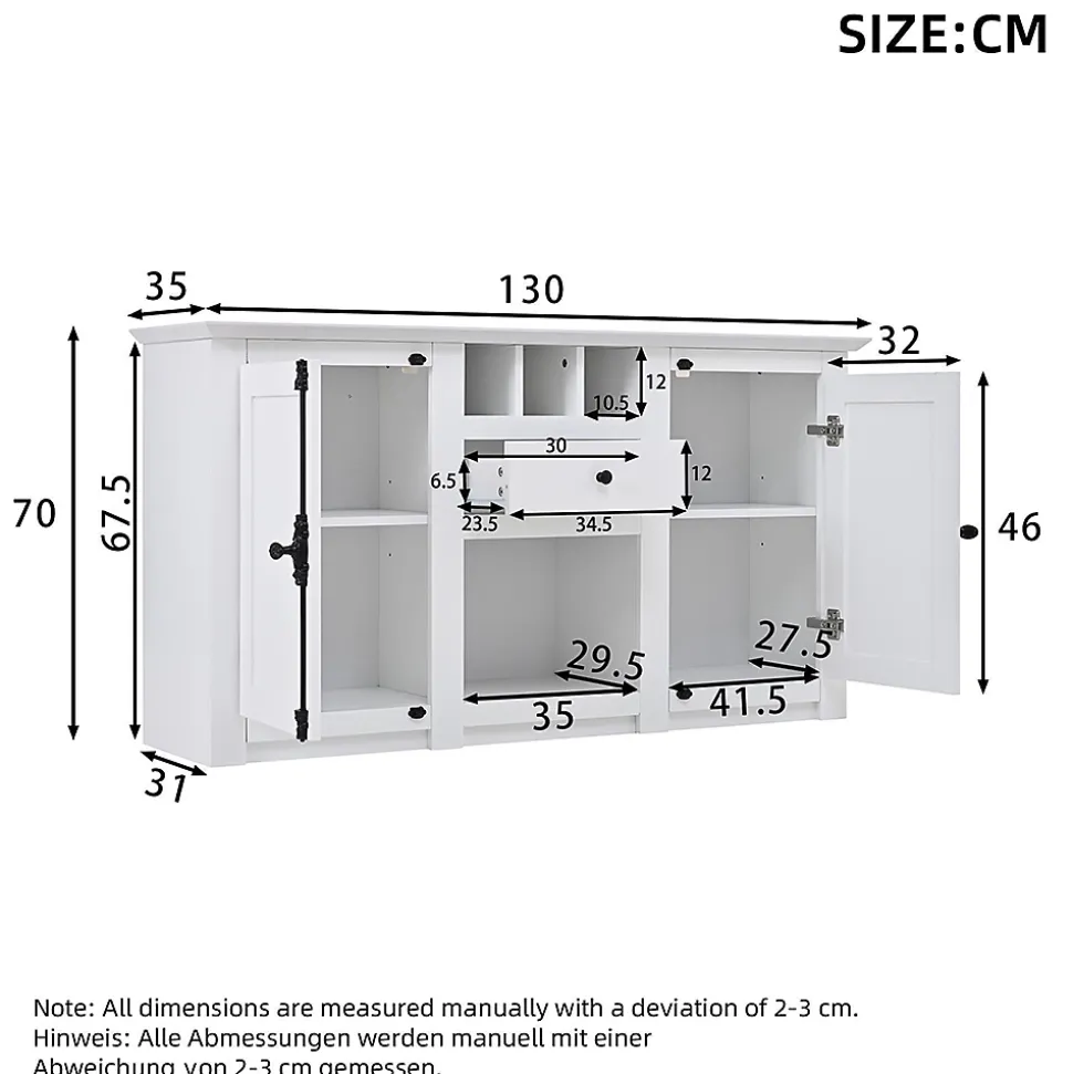 - Taille parfaite : avec ses dimensions de 130 x 35 x 70 cm, ce buffet de salon a la taille idéale et ne prend pas trop de place. Son design raffiné et son espace de rangement généreux répondent aux besoins de rangement et de présentation de votre salon.