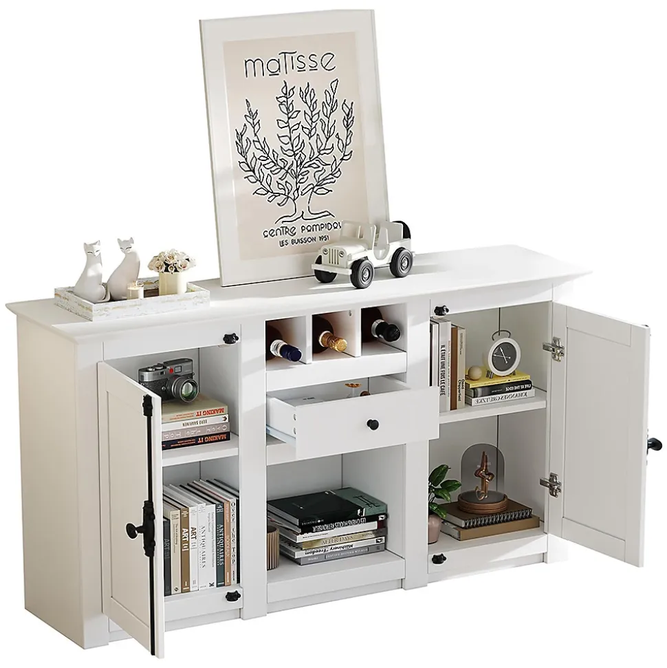 - Rangement multicouche : 2 portes + 1 tiroir + 1 compartiment semi-ouvert + 3 casiers à vin. Les portes sont équipées de deux compartiments réglables en hauteur, qui permettent de ranger séparément livres, petits objets et bricoles. Le compartiment supérieur spacieux est idéal pour exposer des objets décoratifs et permet de garder votre salon bien rangé et ordonné.