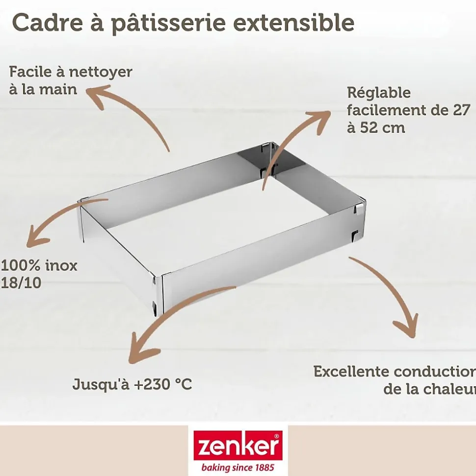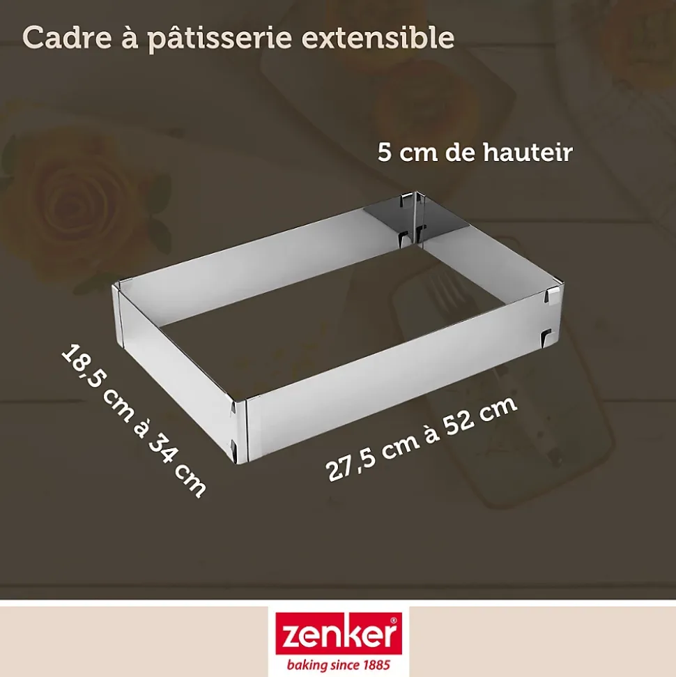 DESCRIPTION : Cadre de gâteau extensible et rectangle pour faire des gâteaux rectangulairesLE PETIT + : Ce moule à gâteau est extensible et permet de faire des gâteaux cuits ou nonCOMPOSITION : Acier inoxydableDIMENSIONS : Longueur : 27,5 à 52 cm ; Largeur : 18,5 à 34 cm ; Hauteur : 5 cmCONTENU : 1 cadre à gâteau extensibleCe cadre à gâteau permet de cuire des gâteaux, des gratins, des cookies et beaucoup d’autres choses. Le moule à gâteau est rectangulaire et extensible ce qui vous permet de réaliser des recettes de toutes les tailles souhaitées.Zenker est une marque faisant partie du groupe Fackelmann Brands et elle propose une large gamme d’ustensiles de pâtisserie et de moules à gâteaux. Concernant les ustensiles de pâtisserie, Zenker frappe fort en mettant à disposition des ustensiles de préparation mais aussi de décoration pour les pâtissiers confirmés. Côté moules à gâteaux c’est une marque pionnière qui propose des innovations telles que les moules à gâteaux en silicone et fibre de verre ne nécessitant pas de matière grasse et proposant des résultats de cuisson incroyables.Zenker possède donc une large gamme d’accessoires et d’ustensiles pour vous accompagner dans vos recettes du quotidien mais aussi pour des évènements exceptionnels comme les fêtes, les anniversaires, les mariages, etc.