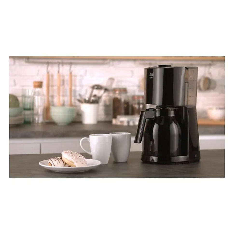 La cafetiere filtre MELITTA – Enjoy II Therm Noir 1017-06 est équipée d’une fonction AromaSelector pour régler l’intensité du café. Elle dispose également d’un porte-filtre pivotant amovible compatible lave-vaisselle, d’un systeme anti-gouttes, d’un réservoir a eau transparent avec indicateur externe du niveau d’eau, d’un arret automatique et d’un interrupteur ON/OFF lumineux.