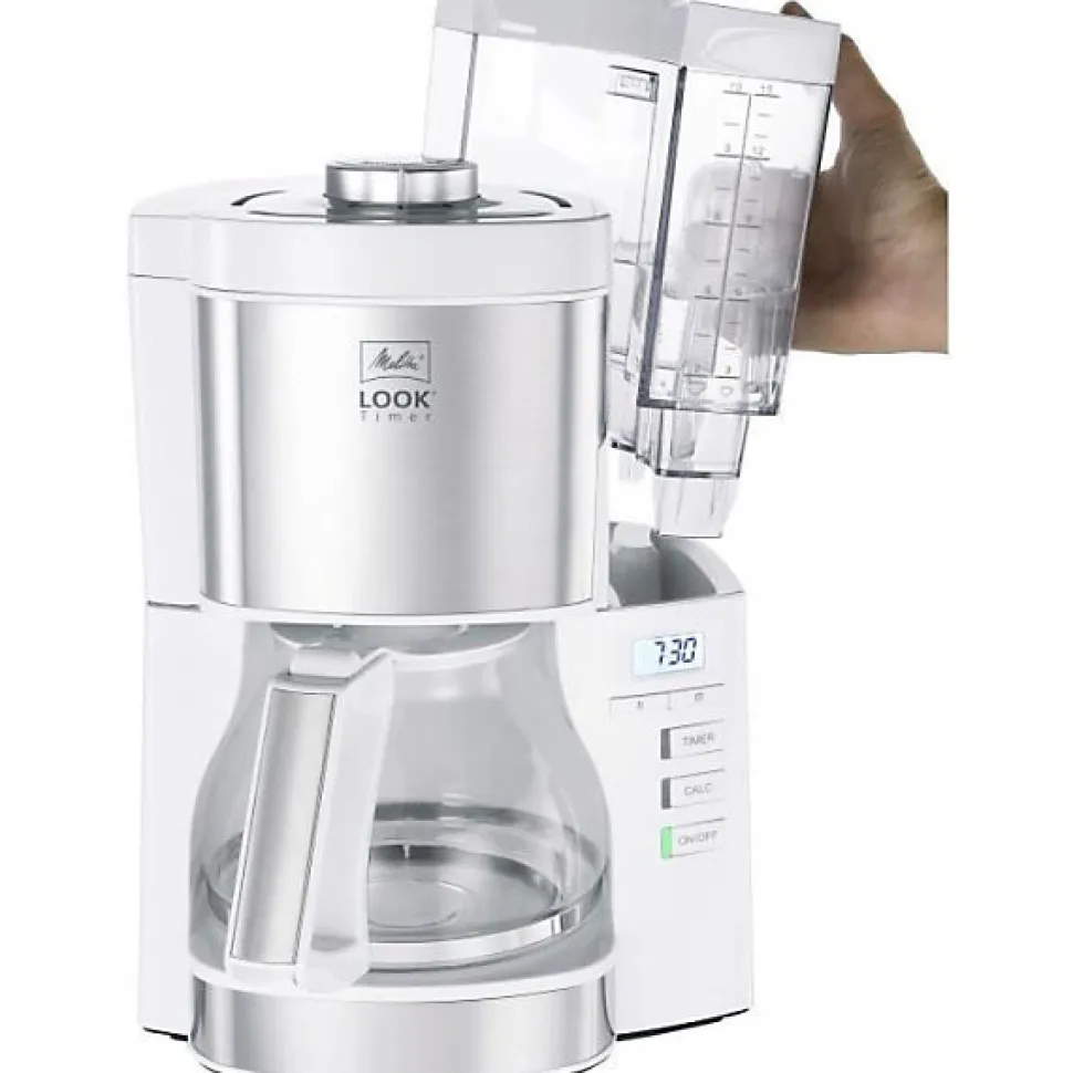 Découvrez la cafetiere filtre Melitta Look V Timer 1025-07, avec une capacité de 1,25 litre pour 10 tasses. Puissante avec 1080 Watts, elle dispose d’un porte-filtre amovible, d’un systeme anti-gouttes et d’une fonction maintien au chaud. Idéale pour les amateurs de café moulu, elle est également programmable pour un confort optimal.