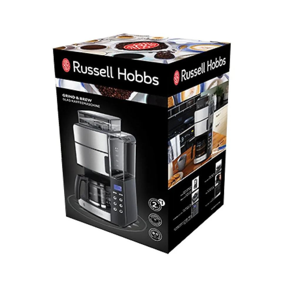 Russell Hobbs Grind & Brew – Cafetière filtre entièrement automatique 1,25 L (10 tasses) avec broyeur intégré, carafe verre, panneaux inox et corps noir, programmable avec minuterie et réglage d’intensité, puissance 1000 W.