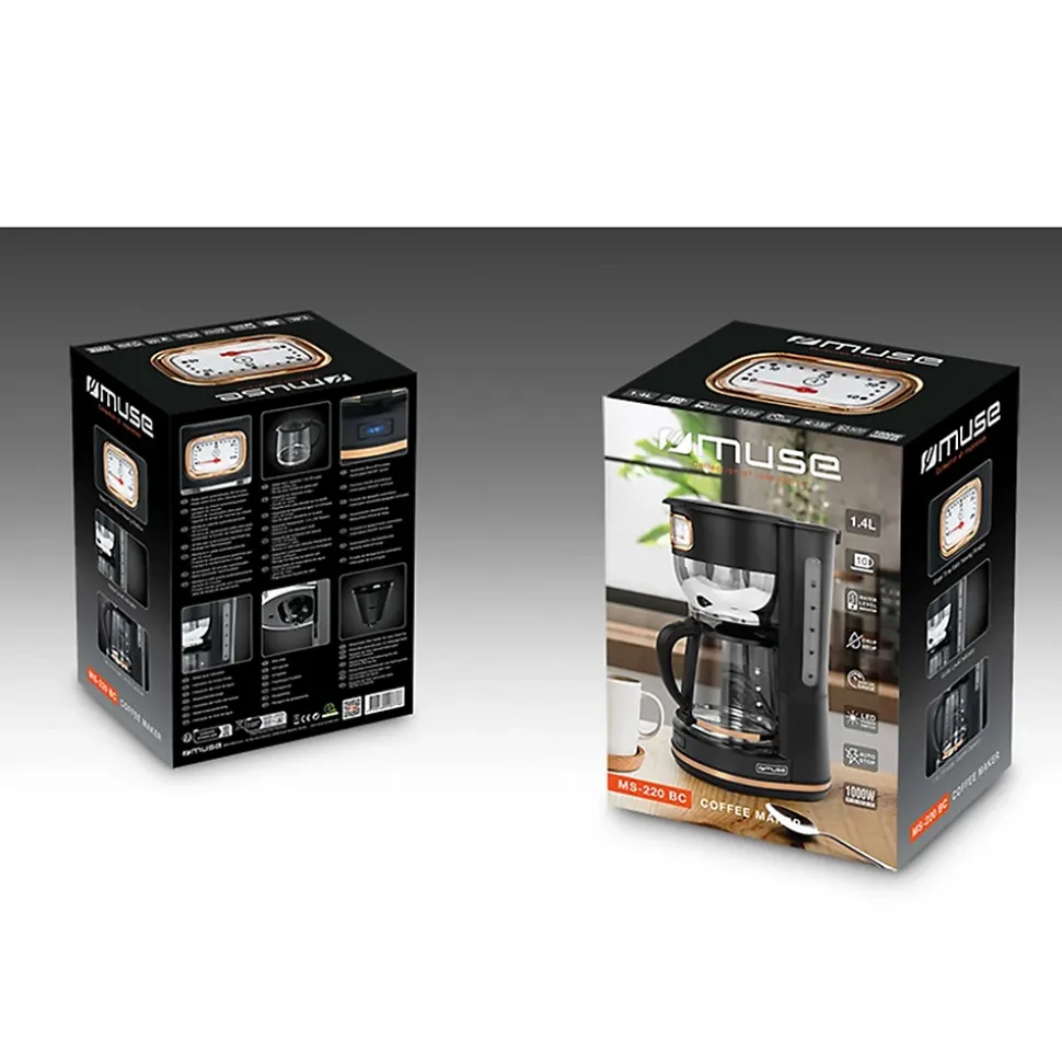 Cafetière Muse MS-220 BC – Porte-filtre – 1000W – réservoir d’eau : 1.4 L (10 tasses) – Cadrant rétro de maintien de la températureCARACTÉRISTIQUES :- Indication du niveau d’eau- Porte-filtre amovible facile à nettoyer et à entretenir- Système stop-goutte- Arrêt automatique- Interrupteur ON/OFF LumineuxFONCTIONS :- Capacité du réservoir d’eau : 1.4 L (10 tasses)- Verseuse en verre- Conservation de la chaleur pendant 40 min- Cadrant rétro de maintien de la température- Poignée ergonomiquePUISSANCE :- 1000WALIMENTATION :- 220-240V, 50/60HzPRODUIT :- 353 mm (H) x 191 mm (P) x 270 mm (L)- Poids net: 2 kg…