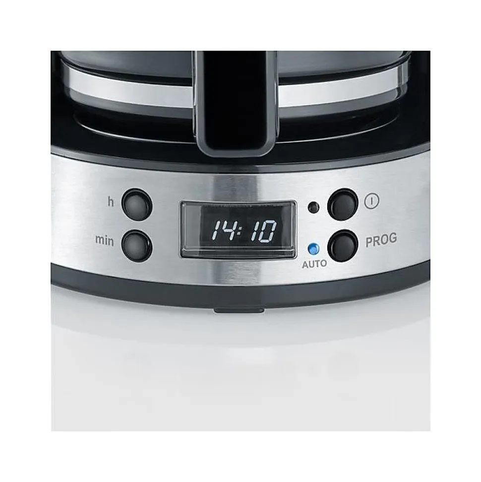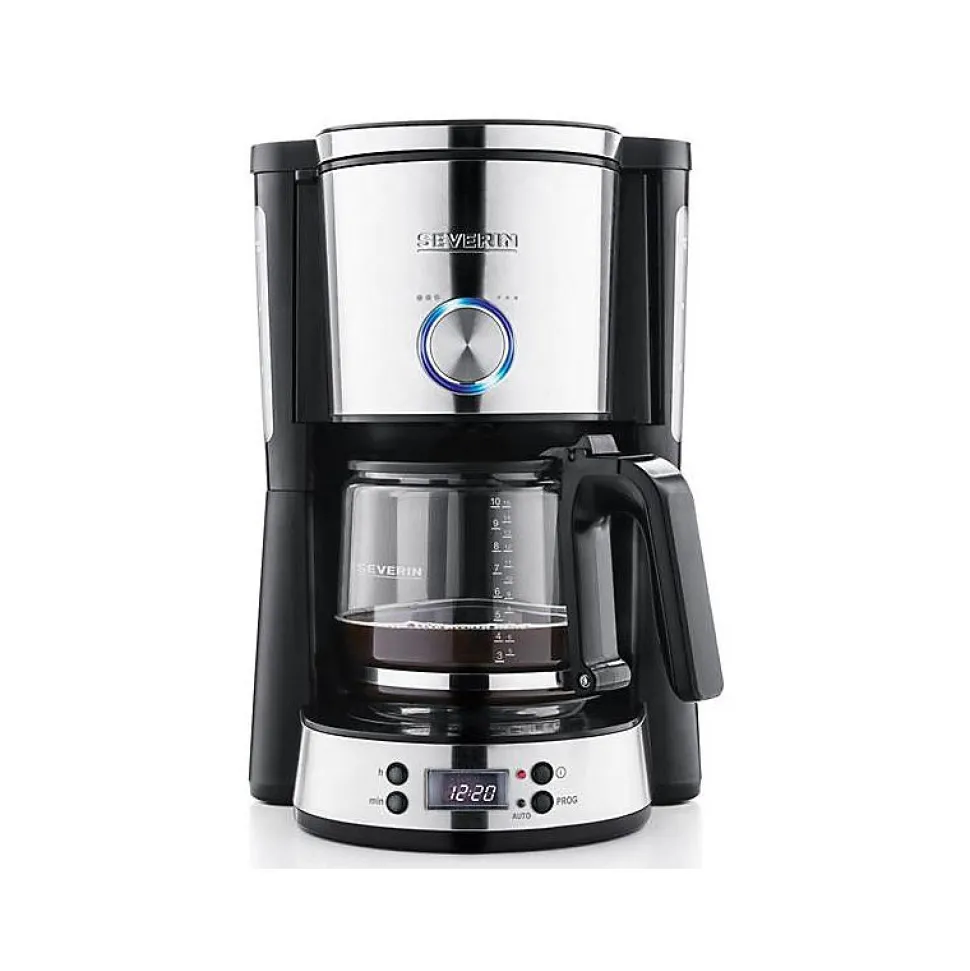 Cafetière filtre programmable Severin KA 4826 1000 W Inox brossé et Noir avec écran LCD, programmation jusqu’à 24h à l’avance, sélecteur d’intensité AromaSwitch sur 5 niveaux, réservoir inox brossé 1,4L, arrêt automatique après 40 minutes, fonction détartrage automatique, filtre permanent lavable, design élégant et ergonomique pour une utilisation facile et durable.