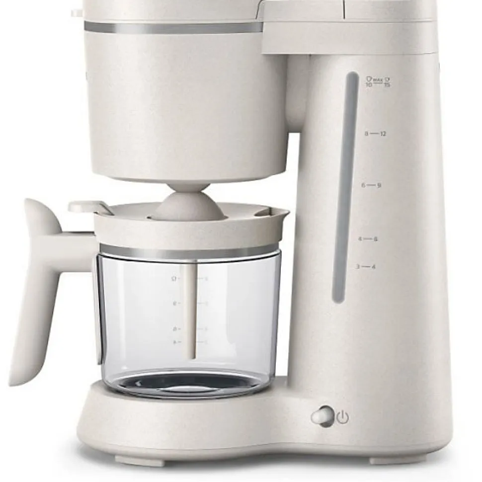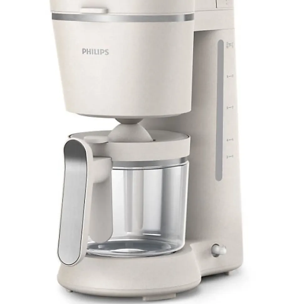 Design économe en ressources et matériaux durablesLa cafetière filtre Philips HD5120/00 allie performance et responsabilité environnementale grâce à son design utilisant 100% de plastiques biosourcés. Ce choix réduit son empreinte carbone de 24% lors de la production, tout en conservant un look élégant avec son fini blanc mat et sa structure compacte.Fonctionnalités intelligentes pour un café parfaitAvec sa capacité de 1,2 litre (10 grandes tasses ou 15 petites), cette machine intègre un arrêt automatique après 30 minutes pour économiser l’énergie. Le système anti-goutte permet de servir une tasse pendant l’infusion, tandis que l’indicateur de niveau d’eau externe garantit un dosage précis.Efficacité énergétique et rapiditéConçue pour les matins pressés, la HD5120/00 prépare un pot complet en seulement 10 minutes grâce à sa puissance de 1000W. Son réservoir de 1320 ml et son filtre amovible simplifient l’utilisation au quotidien, sans compromis sur la qualité aromatique du café.Entretien facile et sécurité optimiséeLe design pensé pour l’utilisateur inclut des éléments démontables pour un nettoyage aisé. La fonction d’extinction automatique apporte une sécurité supplémentaire, idéale pour les familles ou les bureaux.Philips, marque néerlandaise fondée en 1891, est reconnue mondialement pour son innovation technologique et son engagement envers le développement durable. Ses appareils électroménagers allient fiabilité et faible consommation électrique.Matériaux 100% biosourcés réduisant l’empreinte carboneArrêt automatique après 30 minutes pour économie d’énergieCapacité XL de 1,2 litre (15 tasses)Système anti-goutte pour service immédiatIndicateur de niveau d’eau et design compact