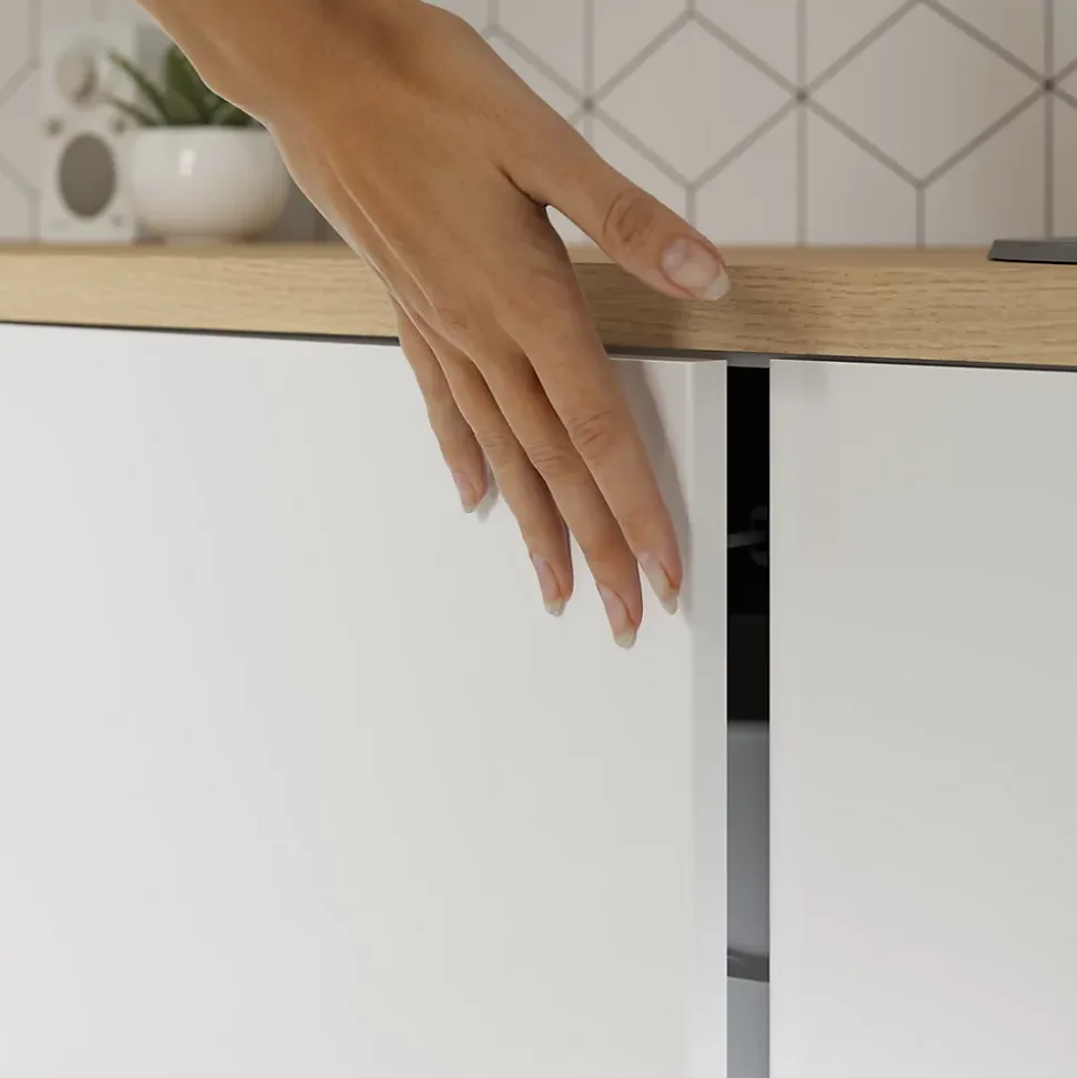 Nous avons conçu nos meubles de cuisine dans une perspective de durabilité. Ils sont voués à subir beaucoup d’usure et doivent donc être résistants. Des panneaux de 1,8cm d’épaisseur et une protection ABS sur les bords avant protègent ce meuble bas contre les chocs et garantissent sa robustesse. Ce meuble est livré avec 1 tablette, 4 pieds, des taquets en métal, un montant de support central, des fixations d’assemblage et une notice. Nous proposons une large gamme de charnières disponibles séparément. Vous pouvez choisir des solutions à ouverture Push to open ou à fermeture amortie. Un détail qui fait toute la différence.