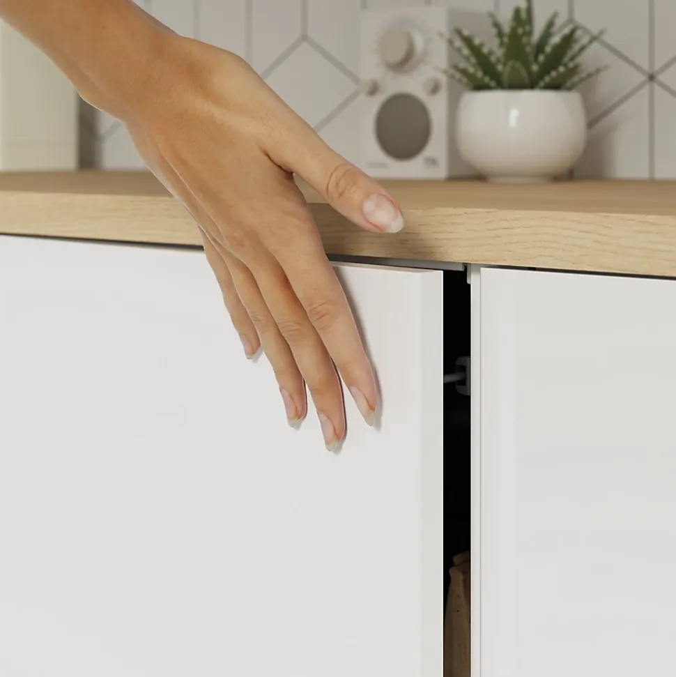 Nous avons conçu nos meubles de cuisine dans une perspective de durabilité. Ils sont voués à subir beaucoup d’usure et doivent donc être résistants. Des panneaux de 1,8cm d’épaisseur et une protection ABS sur les bords avant protègent ce meuble bas contre les chocs et garantissent sa robustesse. Ce meuble est livré avec 1 tablette, 4 pieds, des taquets en métal, des fixations d’assemblage et une notice. Nous proposons une large gamme de charnières disponibles séparément. Vous pouvez choisir des solutions à ouverture Push to open ou à fermeture amortie. Un détail qui fait toute la différence