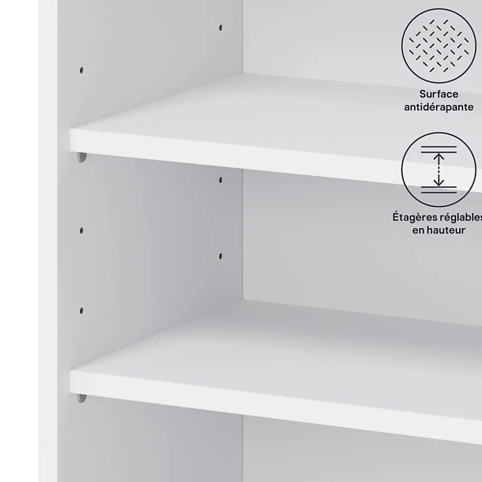 - Livré avec 2 tablettes, des supports muraux, des raccords et une notice.