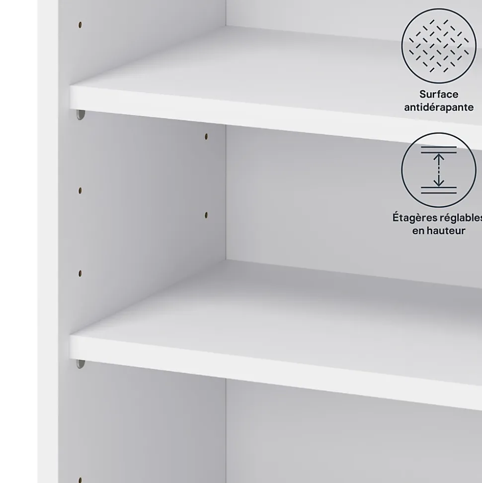 - Livré avec 2 tablettes, des supports muraux, des raccords et une notice.