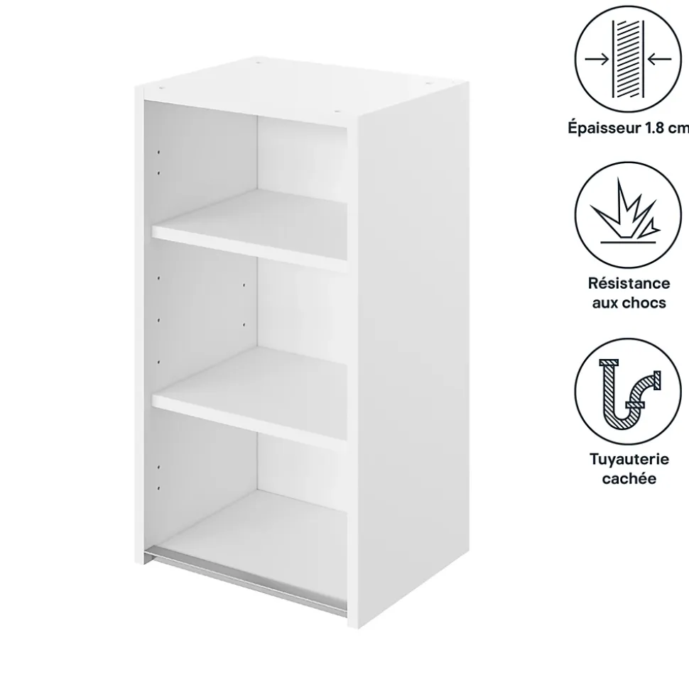 - Ce caisson haut dispose d’un vide sanitaire de 1,9 cm afin que toutes tuyauterie puissent être cachées derrière le panneau de fond.