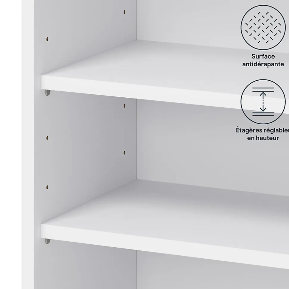 - Livré avec 2 tablettes, des supports muraux, des raccords et une notice.