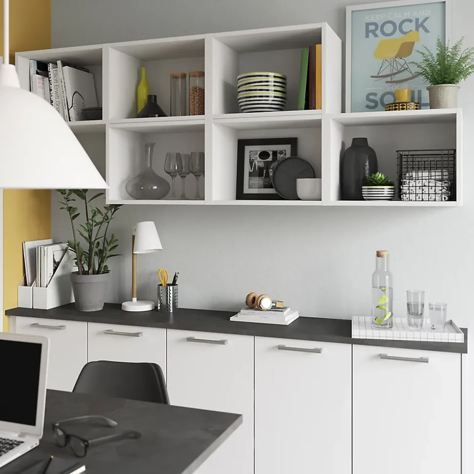 Notre caisson haut a été conçu avec une grande profondeur pour s’adapter au niveau de vos portes de cuisine. Ce meuble est livré avec des fixations murales dissimulées, des fixations d’assemblage et une notice