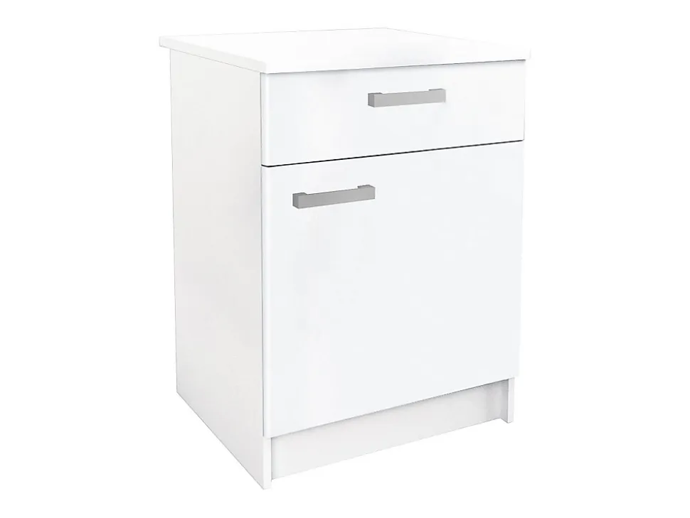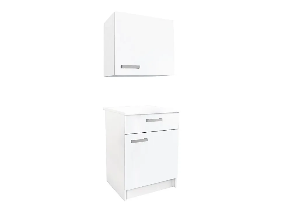 Caractéristiques Couleur (nuance) : Blanc Matière (précision) : Mdf, Panneau de particule Finition : Mélaminé Type de meuble de cuisine : Caisson haut, Casserolier Nombre de meubles : 2 2 portes Porte battante Type de rangement : 1 tiroir Tiroir coulissant Avec ou sans plan de travail : Avec plan de travail Avec ou sans électroménager : Sans électroménager Type de pose : A poser au sol Sens d’ouverture : Vers l’extérieur Traitement : Résistant à la chaleur, Résistant à la vapeur, Résistant à l’eau Entretien : Laver avec un chiffon humide Gamme : Good for Planet Produit : Fabriqué en France À monter soi-mêmeDimensions Longueur : 60 cm Hauteur : 85 cm Profondeur : 60 cmLivraisonLors de la livraison, il est conseillé de vérifier que le bon nombre de colis a été livré.ColisColis n°1 : Longueur 67 cm, Largeur 60 cm, Hauteur 8 cm, Poids 15 kg. Colis n°2 : Longueur 88 cm, Largeur 64 cm, Hauteur 12 cm, Poids 29 kg.