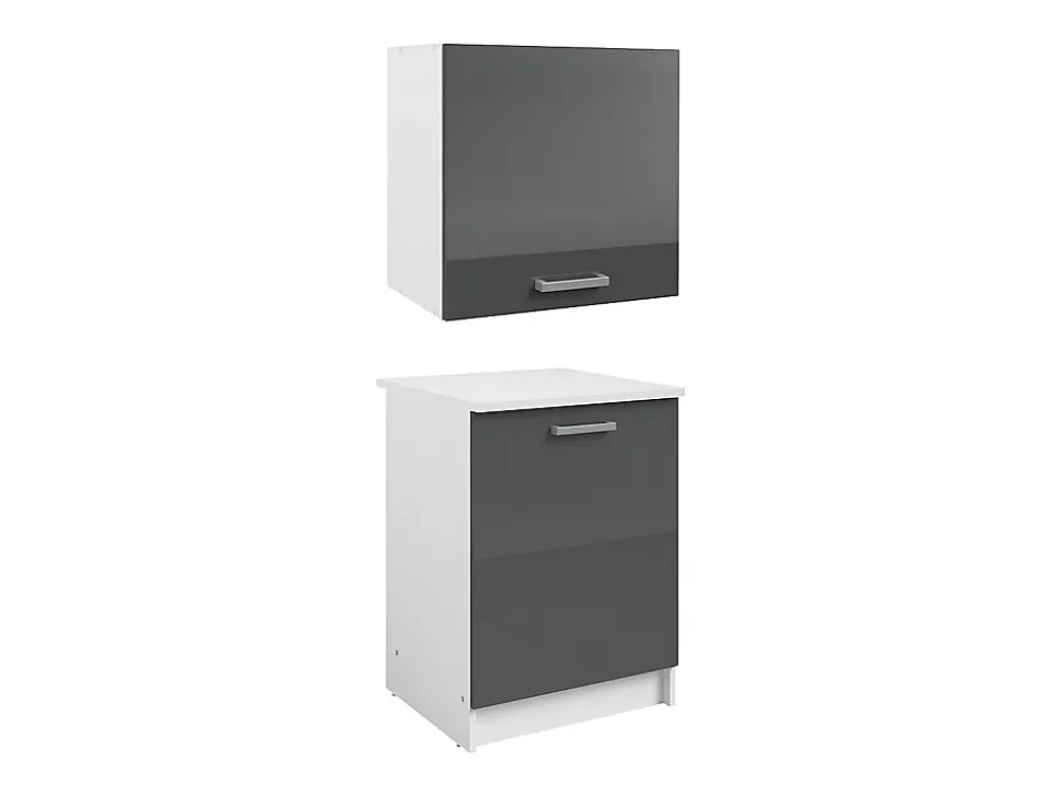 - Caissons de cuisine TRATTORIA – 1 meuble bas & 1 meuble haut – 2 portes – Coloris : Gris brillant et blanc – Style : Moderne – Haut : L60xP60xH84cm – Bas : L60xP33,3xH55,4cm – Tous aux fourneaux avec les caissons de cuisine TRATTORIA !