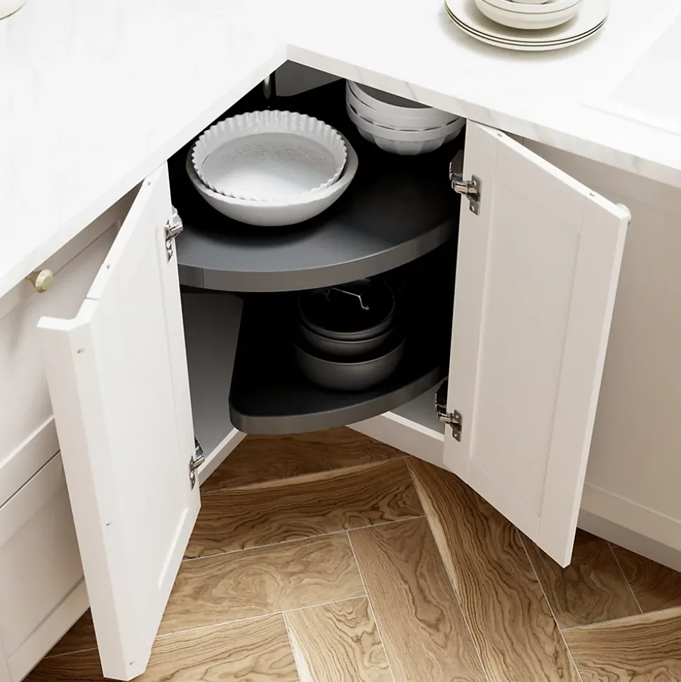 Exploitez au maximum l’espace de votre caisson d’angle grâce à un carrousel d’angle pivotant à 360 °. Conçu pour vous permettre d’accéder facilement à tous vos aliments et ustensiles de cuisine.