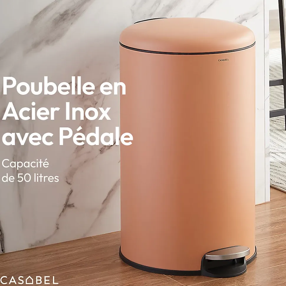 Cette poubelle de 50 L au design rond et compact offre une grande capacité, idéale pour les déchets quotidiens aussi bien en cuisine qu’au bureau. Conçue sans seau intérieur, elle dispose d’un anneau pratique pour maintenir le sac parfaitement en place, facilitant le nettoyage et l’utilisation au quotidien. Sa pédale robuste permet une ouverture hygiénique sans les mains, tandis que le couvercle à fermeture douce assure un usage silencieux et discret. Fabriquée en acier inoxydable brossé anti-traces, elle conserve une apparence propre et élégante même en cas d’utilisation intensive, y compris dans la salle de bain. Une poignée intégrée à l’arrière permet de la déplacer facilement et sans effort lors du ménage.