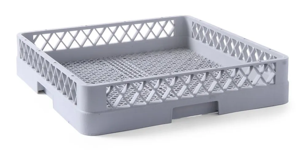 Casier à couverts 500x500x(H)100mm La structure permet un débit d’eau maximum entre les plats dans toutes les directions . Bac à mailles fines afin d’empêcher les couverts de tomber en-dessous du panier.