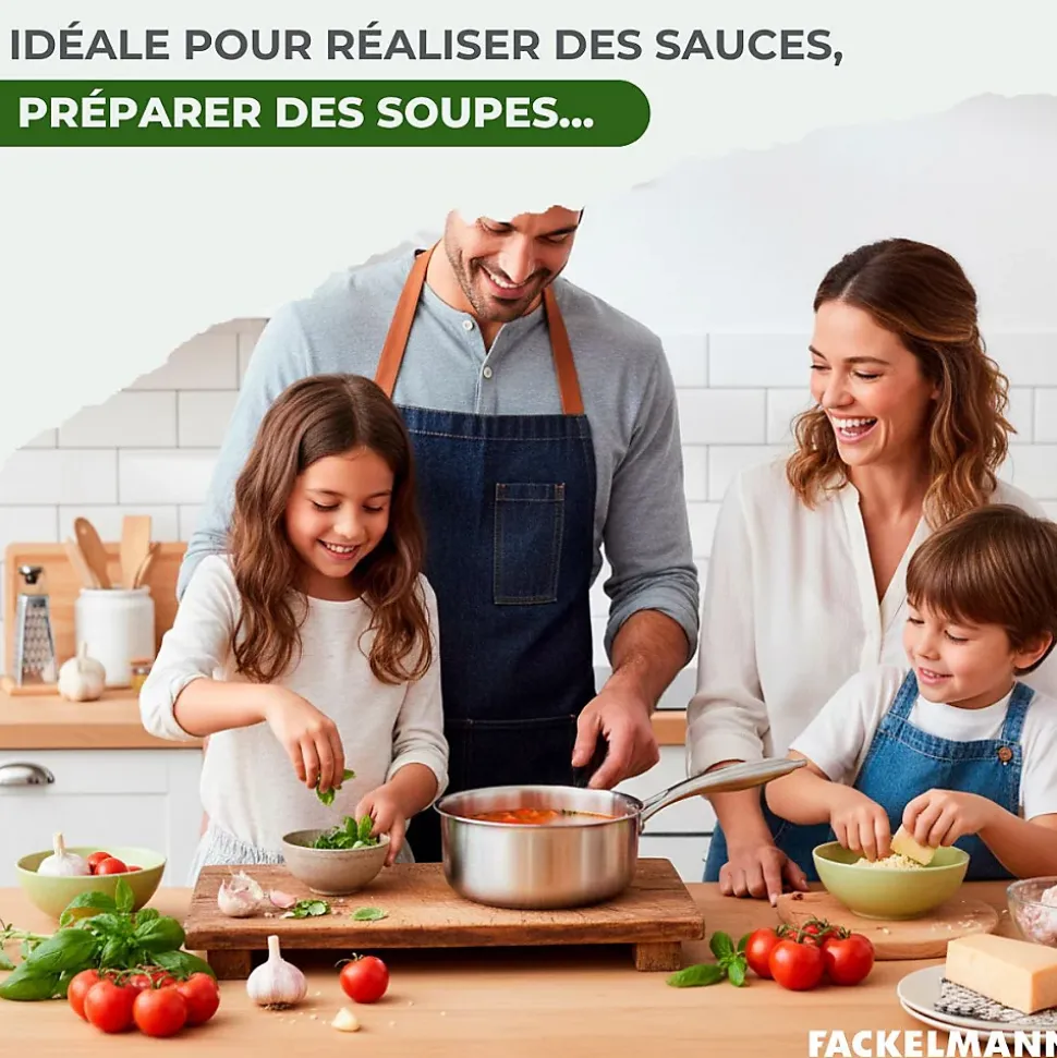 DESCRIPTION: Casserole 14 cm en acier inoxydable 18/10 triply Fackelmann Vita3, idéal pour une cuisson saine et uniforme aux résultats professionnelsPETIT +: Sa surface acier inoxydable ne réagit pas avec les aliments acides ou alcalins et préserve ainsi la saveur originale de vos préparations ; manche en acier riveté pour une solidité optimaleCOMPOSITION: Structure triply en acier inoxydable 18/10 avec noyau en aluminium pour une excellente diffusion de la chaleur, sans revêtement antiadhésif ni PFASDIMENSIONS: Diamètre 14 cm, hauteur 6,5 cm, diamètre fond 12 cm, manche 18,5 cm caUTILISATION: Convient à tous types de cuisinières dont induction, et passe au four jusqu’à 200°C ; parfait pour faire chauffer des liquides, cuire facilement riz, légumes, oeufs durs, ou pour préparer une sauce ou une soupe riches en saveurENTRETIEN: Robuste et conçu pour durer, elle convient à utilisation intensive ; lavable au lave-vaisselle, surface polie facile à nettoyer avec éponges métalliquesLa série Vita3 de Fackelmann cm a été conçue pour ceux qui recherchent une cuisine plus naturelle, saine et efficace. Avec sa structure triply, la casserole 14 cm Fackelmann Vita3 combine une couche intérieure et extérieure en acier inoxydable 18/10 avec un noyau en aluminium, ce qui garantit une répartition homogène de la chaleur sur toute la surface.Grâce à son triple fond diffuseur, elle est parfaite pour faire chauffer des liquides, cuire facilement le riz, les légumes les oeufs durs, ou pour préparer une sauce, une compote ou une soupe riches en saveur. Avec son diamètre de 14 cm, cette casserole convient pour 1 personne ou de petites quantités.Sans revêtement antiadhésif ni PFAS, elle permet de cuisiner sainement sans se soucier de l’usur…