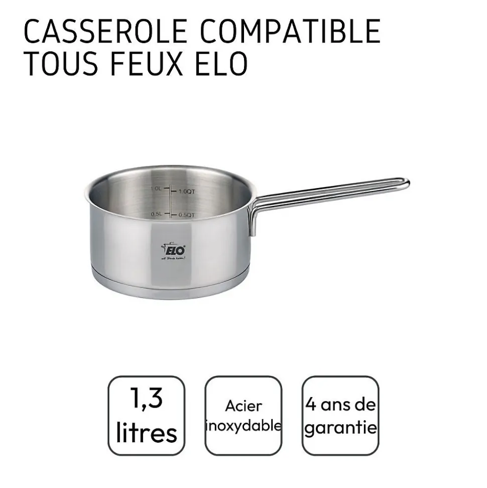 DESCRIPTION : Elo vous propose cette casserole de cuisine à long manche de 16cm de diamètre pour cuire vos pâtes, vos œufs, ou faire fondre du chocolat au bain-marieLE PETIT + : La casserole dispose d’un fond capsulé qui consomme peu d’énergie et est optimale pour la cuisson de tous vos légumes car elle en préserve les vitaminesCOMPOSITION : Acier inoxydable 18/10DIMENSIONS : 17,5x33x8cm (dimensions extérieures), 16cm de diamètre (dimensions intérieures)ENTRETIEN : Le produit passe au lave-vaisselleElo est une marque allemande qui, depuis 1934, réalise des ustensiles et batteries de cuisine en acier inoxydable de qualité supérieure pour faciliter la vie des utilisateurs.Avec Elo, trouvez l’ustensile adéquat pour chacune de vos cuissons et réalisez d’excellents plats à l’aide de poêles, casseroles et faitouts de qualité, avec comme maitre mot votre plaisir.Elo vous propose cette casserole à long manche de 16cm de diamètre.Avec ce produit, vous pourrez facilement réaliser d’excellents plats ou faire cuire vos pâtes. La casserole est compatible avec tous les types de feux, même induction. Conseils d’utilisation :Le produit passe au lave-vaisselle.Dimensions : 17,5x33x8cm
