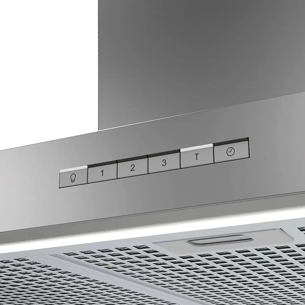 Panneau de commande électronique avec minuterie de mise en veille automatique4 niveaux d’extraction (3+1 Turbo)Capacité d’extraction maximale – minimale (Reg. (UE) nº65/2014) : 802m3/h – 340m3/hDébit d’air maximum du moteur sortie libre : 1350m3/hNiveau sonore (Reg.(EU) nº65/2014) : 50dB(A), maximum : 67dB(A)Moteur BT3. Silencieux. Consommation électrique maximale 280WÉclairage ajustable à haute efficacité utilisant une BANDE LEDSystème d’installation facileFiltres métalliques MAX entièrement en acier inoxydable, lavable au lave-vaisselleFinition acier inoxydable et verre noirPression maximale : 220 PaSortie en diamètre 150 mm (mode recyclage ou évacuation)Classe d’efficacité énergétique : AAccessoires (non inclus) : Filtre à charbon actif. Réf.02859398