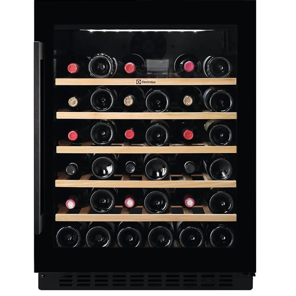 Cave à vin de service 52 bouteilles noir Electrolux – La cave à vin Série 500 EWUS052B5B d’Electrolux a une capacité de 52 bouteilles de vin.Accédez à votre vin facilement et avec aisance grâce aux étagères en bois extensibles sur glissières télescopiques.Assurez-vous d’avoir une visibilité totale des étiquettes de vos millésimes préférés grâce à l’éclairage Lel top. – Type de produit : Cave à vin.Utilisation : Cave de service.Type de pose : Encastrable.Capacité de bouteilles (2021) : 52.Type de froid : Froid brassé.Porte : Vitrée.Porte Réversible : Oui.Mode de contrôle : Electronique.Affichage de la température : Digital.Type de clayette : bois.Nombre de clayettes : 6.Plage de température intérieure : Régulation de température: +5°C à +18°C.Classe climatique : N-ST.Classe énergétique (2021) : G.Perception sonore (en dB) (2021) : 42.Classe de perception sonore (2021) : D.Consommation d’énergie (kWh/an) (2021) : 148.Couleur : Noir.Dimensions du produit (H x L x P en cm) : 82 cm / 59.5 cm / 56.5 cm.Poids net (en Kg) : 48.5 kg.
