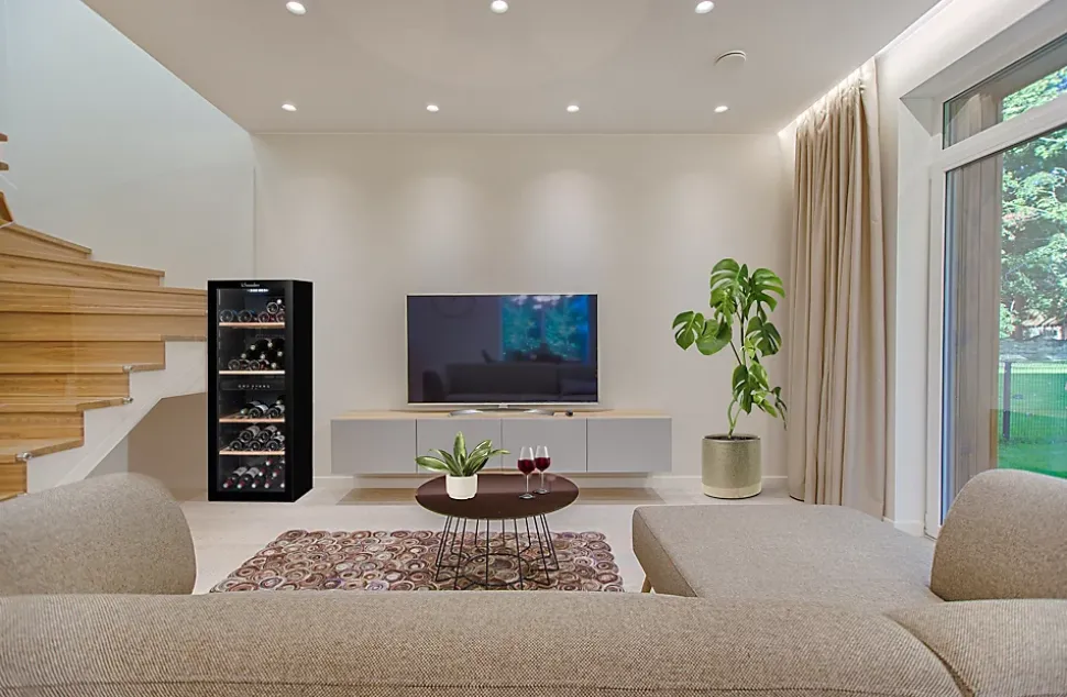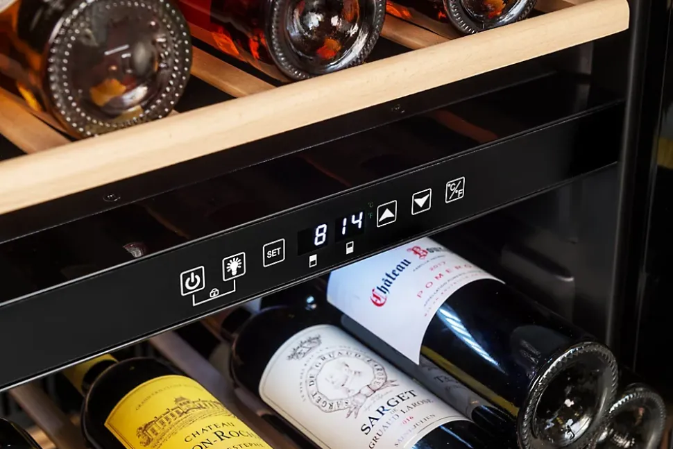 Cave a vin de mise a température double compartiment pour stocker plusieurs types de vins dans une meme cave, capacité de 91 bouteilles type Bordeaux 75cl, encombrement minime, niveau sonore faible et design moderne.
