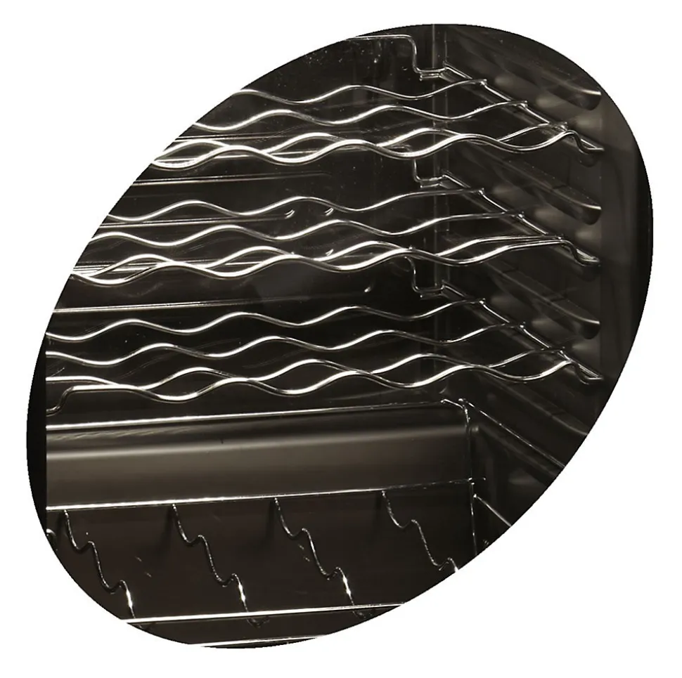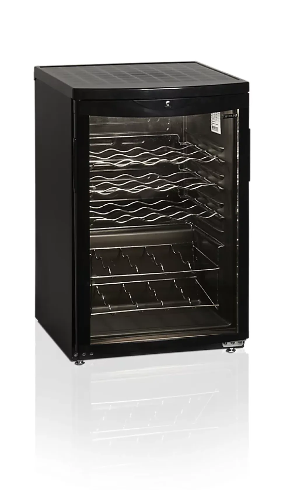 Cave à vin avec une porte vitrée à charnières Mesures et contenu : Bouteilles de vin 750 ml : 22 pcesPlate de température : 2 à 10 °CClasse climatique : 4Poids brut / net : 38 / 33 kgVolume brut / net : 92 / 85 lDesign et matériaux : Nombre et type de porte : 1 porte en verre tinté incurvée à charnièresPorte réversible : OuiVitrage de sécurité : OuiNombre et type de tablettes 4 clayettes à vinPieds : 4 pieds ajustablesFinition extérieure : NoirFinition intérieure : ABS noirÉclairage intérieur : LEDSerrure : OuiFroid et fonctions : Type de régulation : MécaniqueType de réfrigération : StatiqueType de dégivrage : AutomatiqueFluide frigorigène : R600aCharge de gaz : 28 gPuissance et consommation : Consommation d’énergie :