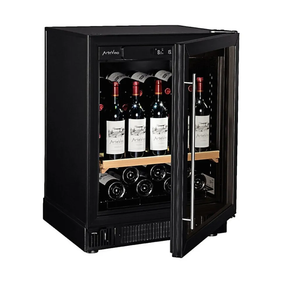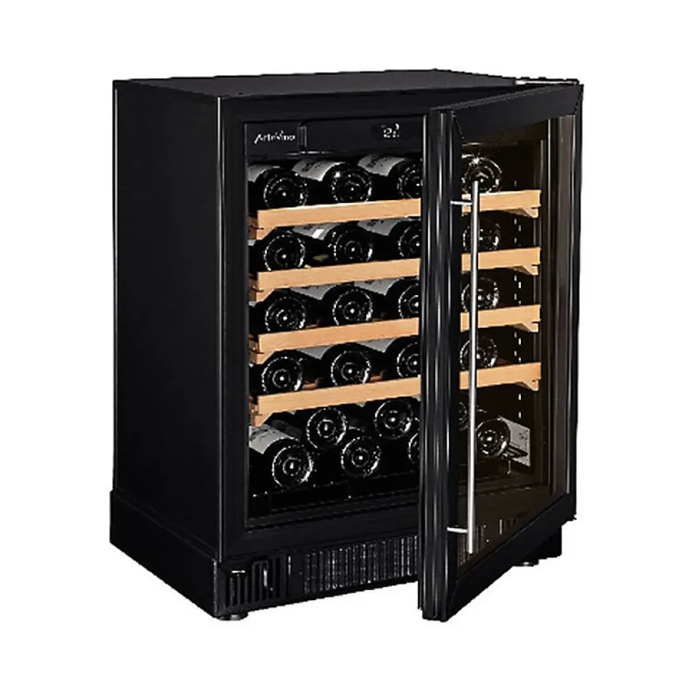 Cave de service Artevino COSYP1T39NVD, cave à vin de vieillissement encastrable, capacité 39 bouteilles, classe énergétique G, niveau sonore 41 dB, éclairage intérieur LED, porte vitrée avec protection UV, contrôle thermostatique avec température entre 9°C et 15°C, silencieuse, 4 clayettes en bois ajustables.