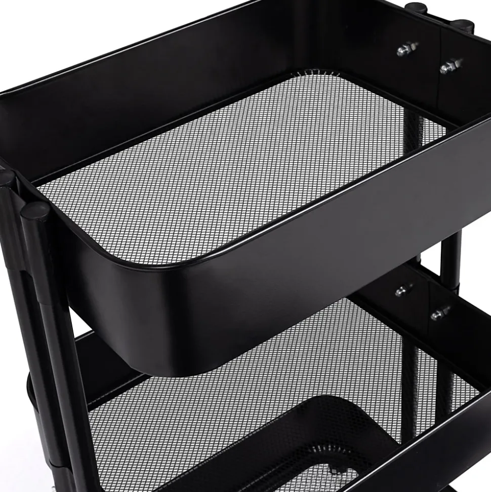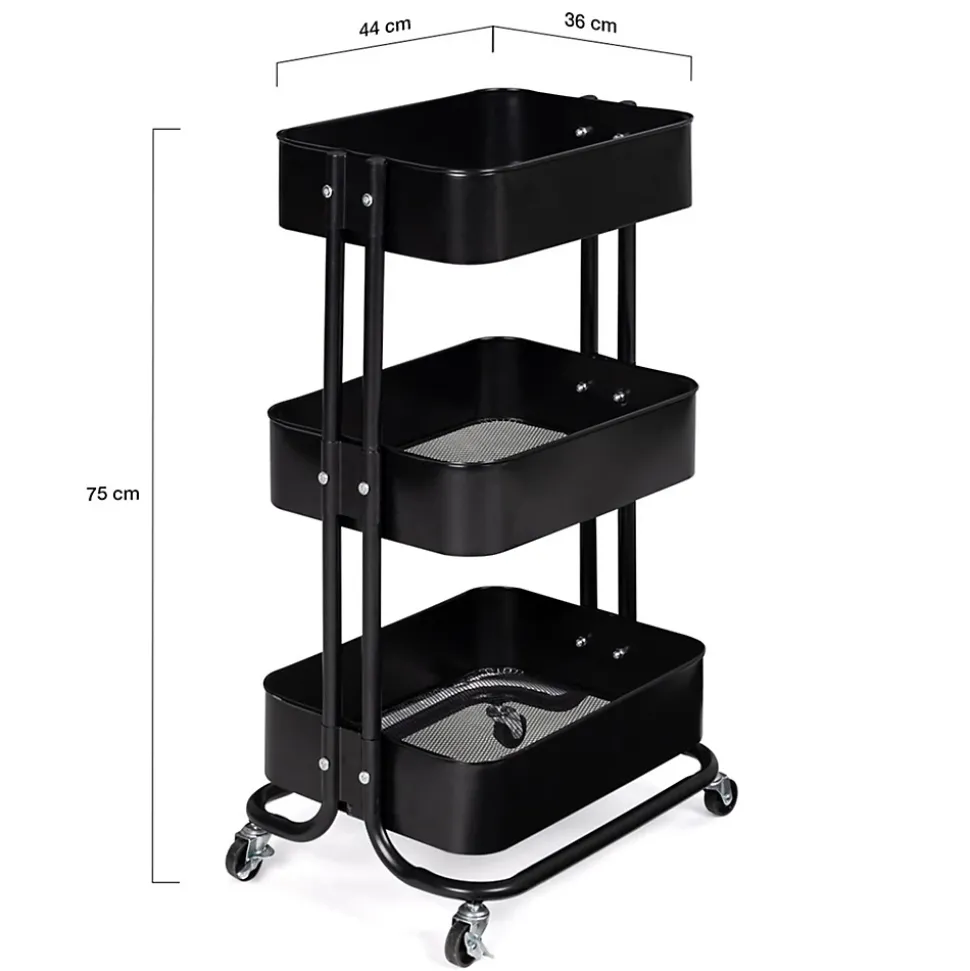 Organisez et optimisez votre espace grâce à ce chariot. Que vous ayez besoin d’une desserte pour ranger vos loisirs ou d’une structure pour organiser votre salle de bain, vous venez de trouver la solution parfaite. Avec ses 3 paniers en métal ajouré, organisez votre espace selon vos besoins. Rangez vos petits bols, épices, livres et boîtes à thé sur ce chariot à roues multidirectionnelles. Ultra pratique, faites rouler la desserte et rangez-là lorsque vous n’en avez pas besoin. Servez-vous de ses paniers aussi bien dans votre intérieur que dans votre garage ! La desserte en métal noir se fondera parfaitement dans l’ensemble de vos pièces. N’hésitez plus et optez dès à présent pour la solution de facilité. Dimensions du chariot 3 niveauxDimensions globales : Longueur 44 x largeur 36 x Hauteur 75 cmDimensions du panier haut : L. 38,5 x l.27,5 x H.8 cmDimensions du panier central : L. 39,5 x l. 28, x H. 8 cmDimensions du panier bas : L. 40,5 x l. 29 x H. 8 cmMatériaux : MétalColoris : NoirÀ monter soi-mêmeRetrouvez l’ensemble de nos accessoires de cuisine sur notre boutique en ligne !