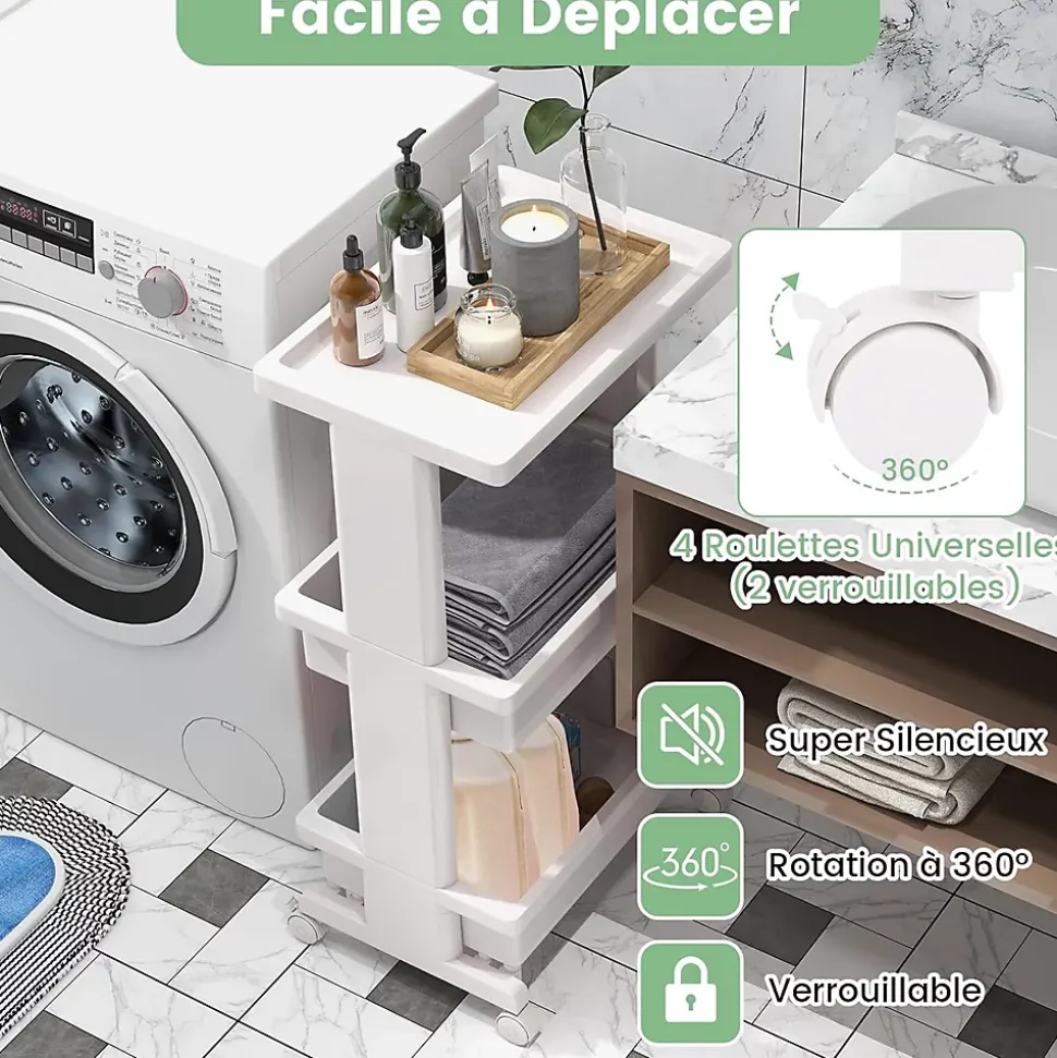 - Facile à Déplacer : Avec 4 roulettes universelles, dont 2 verrouillables, ce chariot offre une mobilité sans effort. Il se déplace facilement dans les coins étroits et sur différentes surfaces, tandis que les roulettes verrouillables assurent la stabilité pour un placement sécurisé.