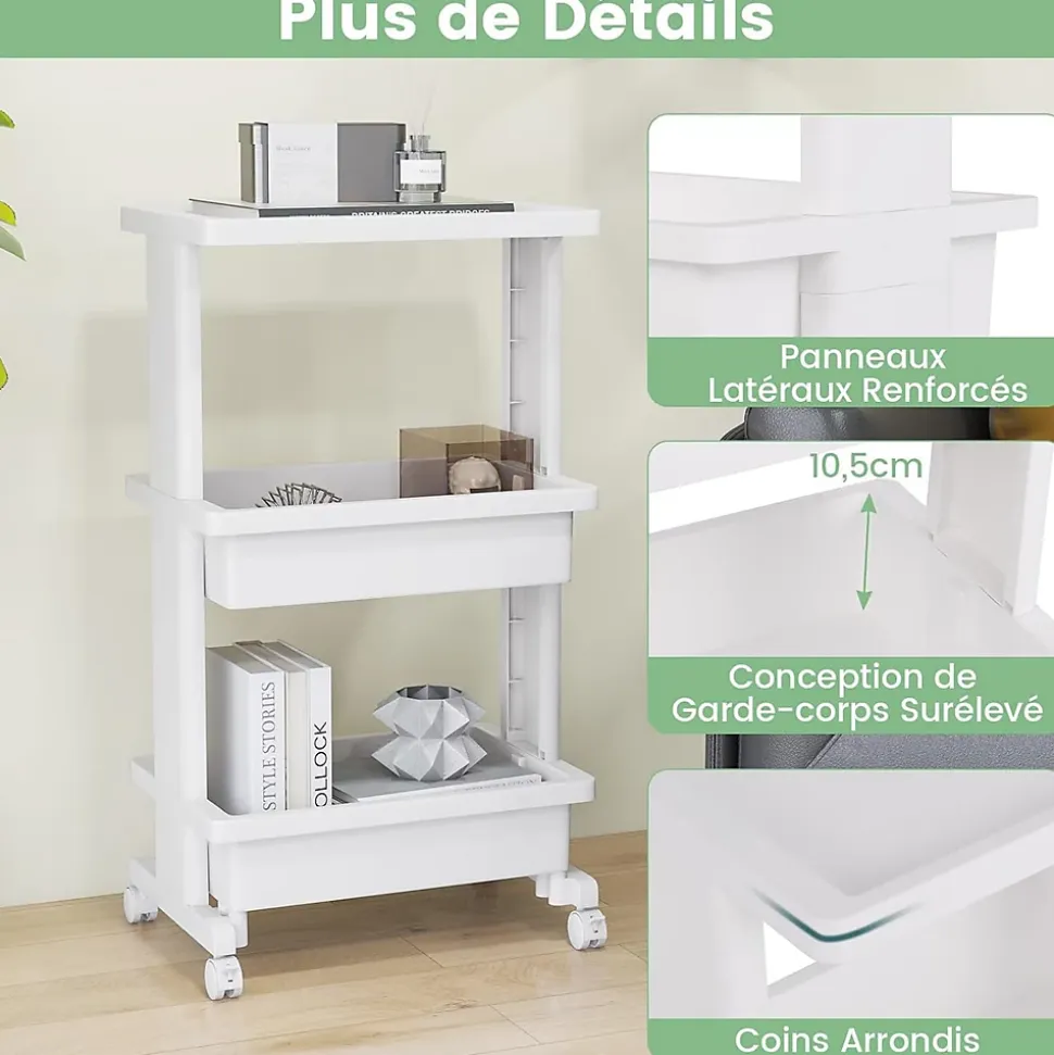 - Entretien et Dimensions Faciles : Ce chariot roulant à 3 niveaux présente une surface lisse et imperméable, ce qui vous permet de le nettoyer facilement avec un chiffon humide. Les dimensions hors tout sont de 45 x 30 x 81 cm (L x l x H).