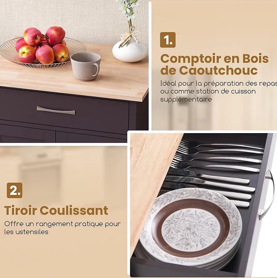 - Rangement Spacieux et Accessible : Gardez vos essentiels de cuisine bien organisés et à portée de main ! Le chariot de cuisine comprend un tiroir pour les ustensiles, une armoire de grande taille pour les outils ou les fournitures de cuisine et une étagère inférieure pour contenir des plats supplémentaires ou des contenants de rangement.
