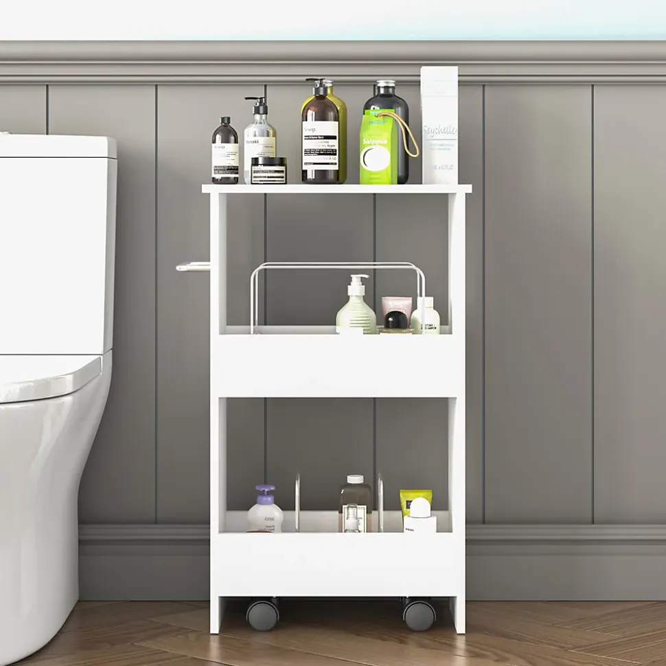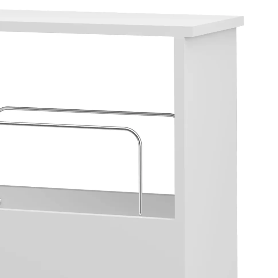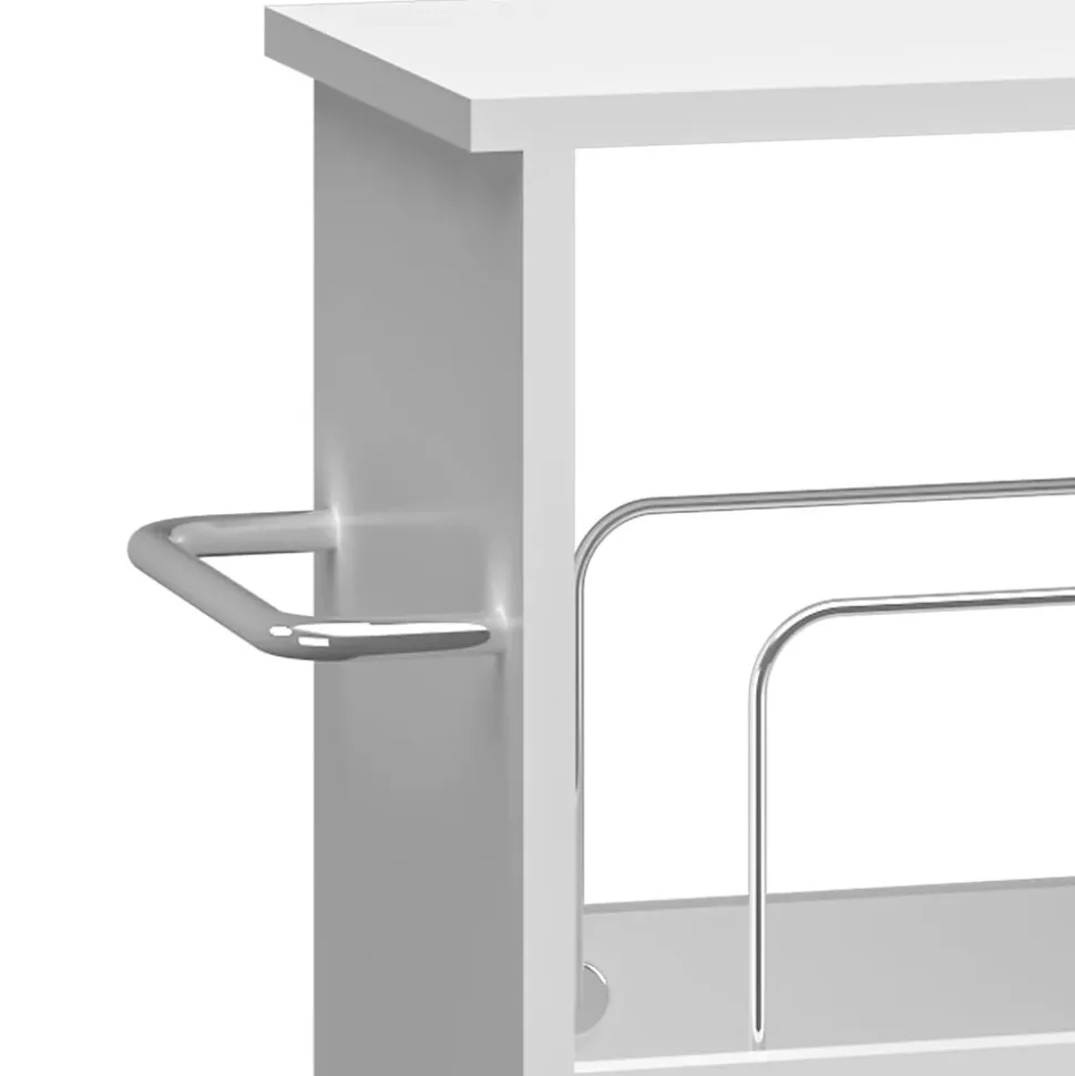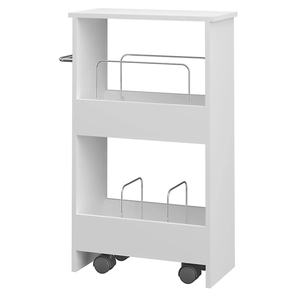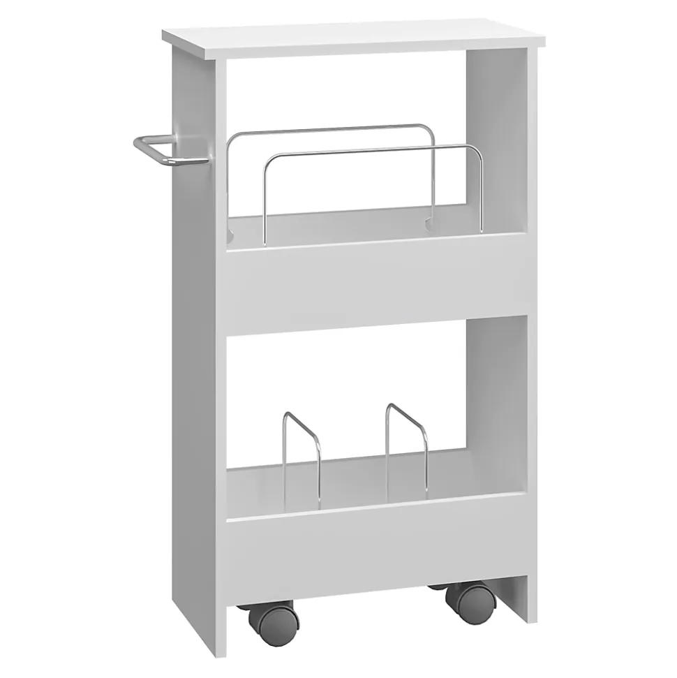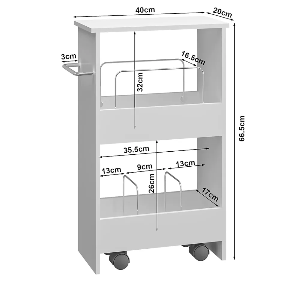 Chariot à roulettesChariot pratique à roulettes, idéal pour un usage flexible à la maison comme au travail. Sa mobilité fluide permet un déplacement facile d’une pièce à l’autre.2 étagères spacieuses permettent de garder huiles, épices et bocaux à portée de main, avec des étriers intégrés pour maintenir les contenants en place lors des déplacements.Polyvalent, il s’utilise aussi bien dans la cuisine que dans la salle de bain ou la buanderie pour ranger soins, produits ménagers ou linge de façon pratique.Poignée latérale en métal pour une manipulation aisée, même dans les espaces restreints.Points forts du produit :- 2 étagères avec barrière de sécurité pour une bonne stabilité des bouteilles- transport sans effort- 2 roulettes avec freins d’arrêt- construction compacte, idéale pour les espaces étroits- poignée pratique pour sortir facilement des niches- organise les ustensiles de cuisine, les produits d’entretien ou de nettoyageDimensions (h x l x p) :- totales : 66,5 x 40 x 20 cm- compartiment supérieur : 32 x 35,5 x 17 cm- compartiment inférieur : 32 x 35,5 x 17 cm- dist. entre les branches en haut : 16,5 cm- dist. entre les branches en bas : 9 cm- dist. entre les arceaux inférieurs et la paroi latérale : 13 cm chacun- largeur de la poignée : 3 cmMatière :- corps : MDF- poignées, étriers de fixation : métal- roulettes : plastiqueCouleur :blancContenu de la livraison :1 x chariot à roulettesProduit de la marque :[en.casa]