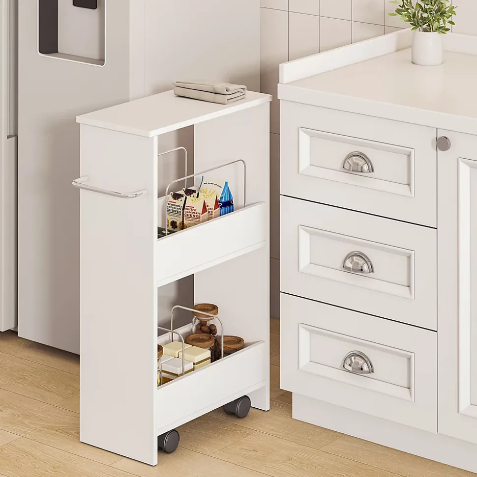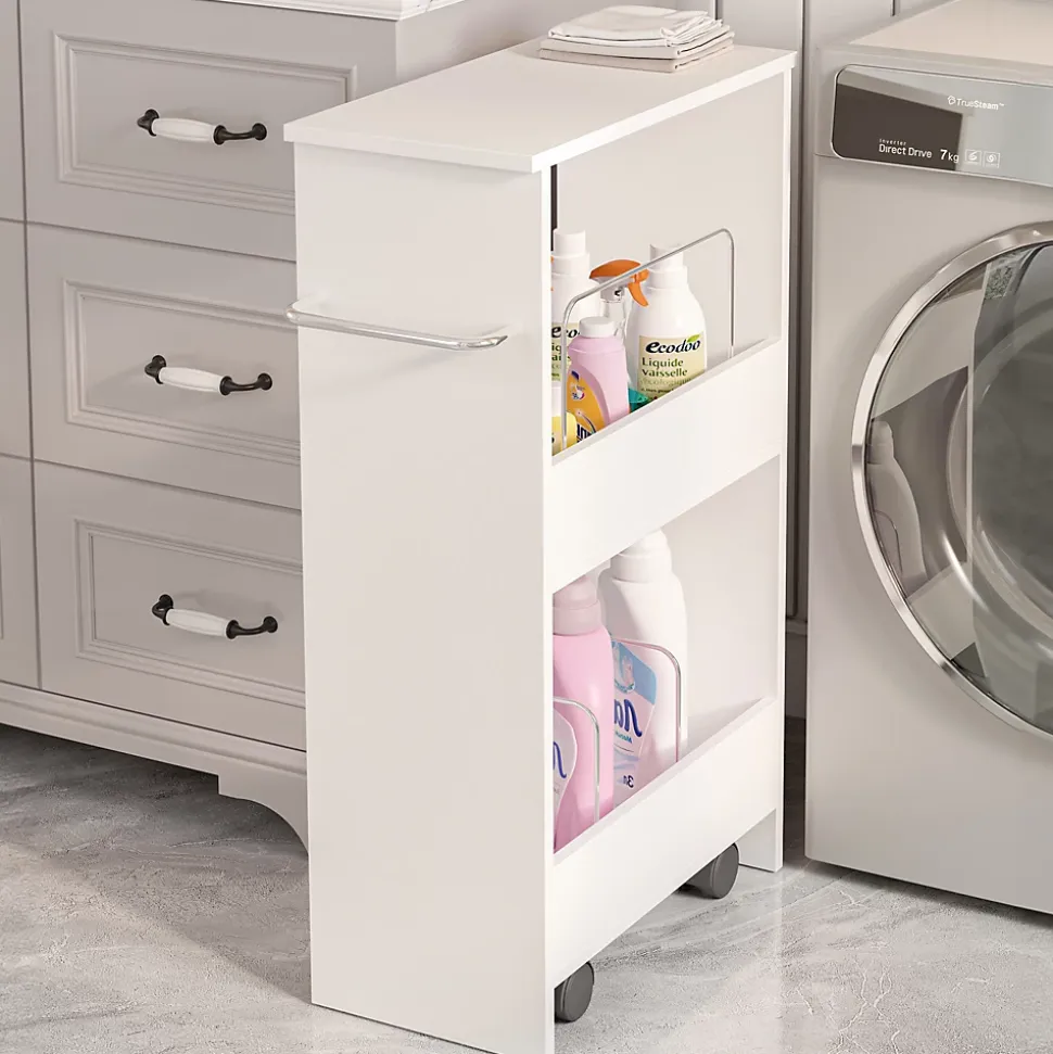 - Format compact pensé pour les petits espaces : sa structure fine permet une intégration parfaite dans des niches étroites, comme entre un réfrigérateur et un mur ou à côté d’un lave-linge.