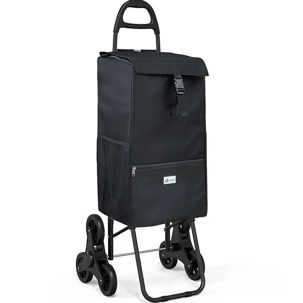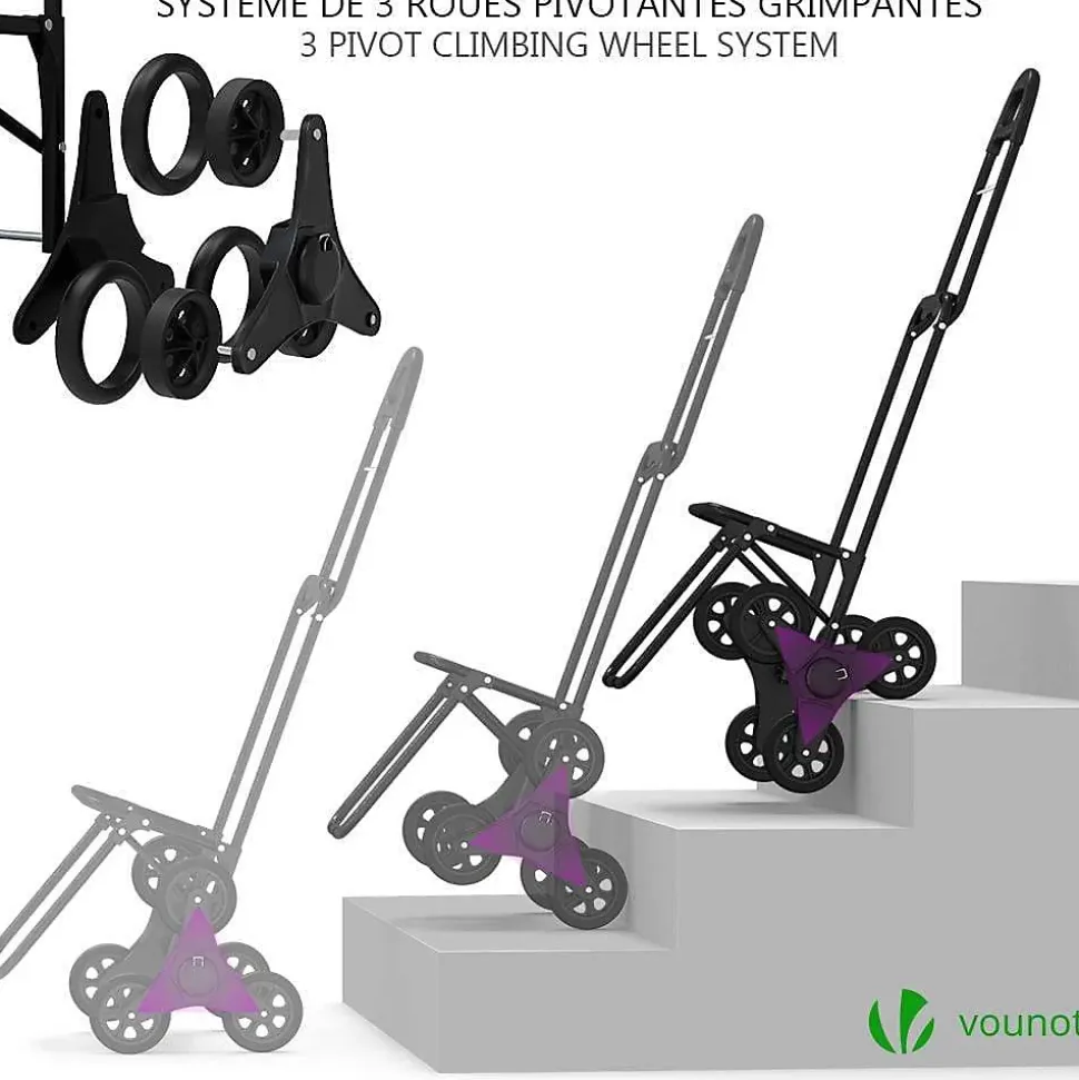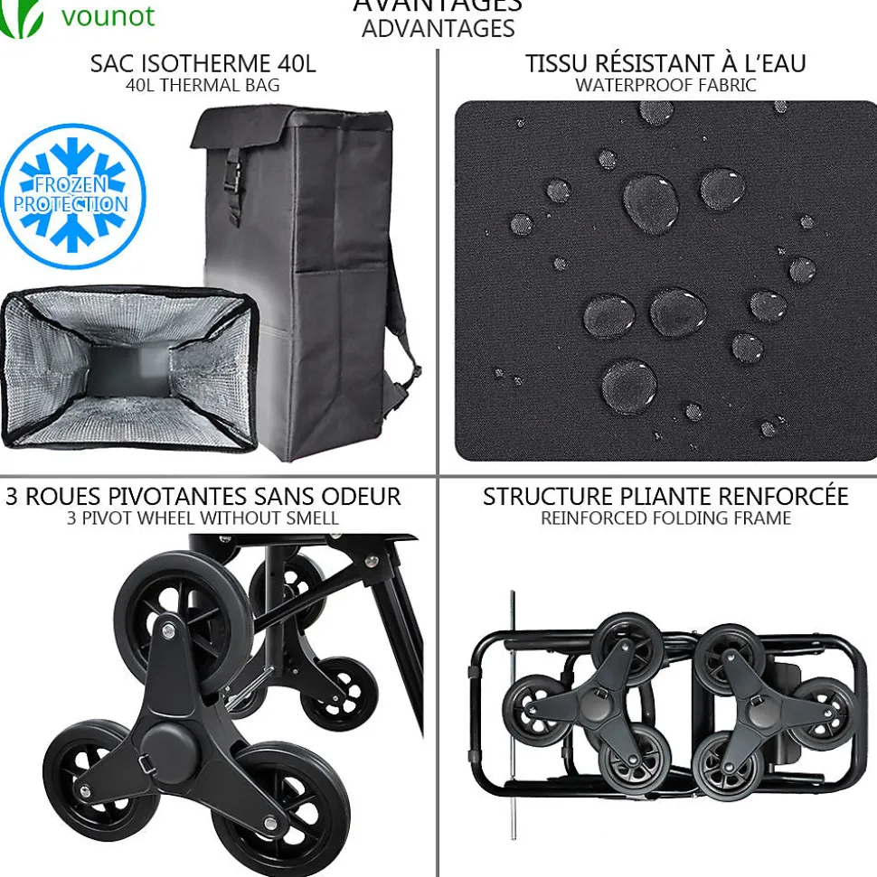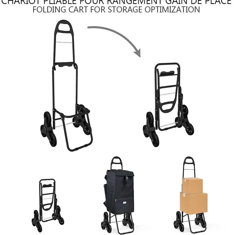 LES + PRODUITS Système de 6 roues monte escalier et trottoir Utilisations multiples Sac isotherme de 40L Facile à installer et rangerPOURQUOI CHOISIR NOTRE PRODUIT ? Le chariot de course à un système de 6 roues qui vous permet de monter ou de descendre les escaliers sans difficulté. Le chariot de course 3 en 1 se transforme également en diable et en sac à dos isotherme. Le chariot de marché est fait de métal résistant qui peut charger jusqu’à 30kg sans problème. Le système de 6 roues lui permet de s’adapter aux obstacles facilement. Le caddie comprend un sac de 40L isotherme vous permettant de mettre plus de 30kg de produits frais. De plus, il possède 3 pochettes de rangement et se transforme en sac à dos !Bande pour la fermeture – Sac de rangement isotherme de 40L – Petit compartiment avec fermeture à glissièreCARACTÉRISTIQUES- Dimensions du sac: env. 33x20x55 cm- Dimensions du cadre: env. 40x45x104 cm- Dimensions des roues: Ø12 cm- Poids: env. 3.0 kg- Couleur: Noir- Matériel: 100% Polyester 600D- Capacité du sac: env. 40L- Charge Max: 30KgIMPORTANT :Les livraisons se font en France métropolitaine à l’exception des îles qui ne sont pas reliées au continent par un pont (Corse, Ile d’Yeux etc.) et des DOM-TOM.