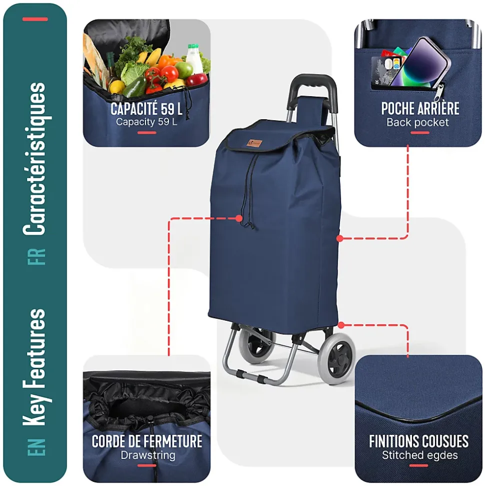 Chariot de courses 2 roues pliable 59L bleu marine VOUNOT