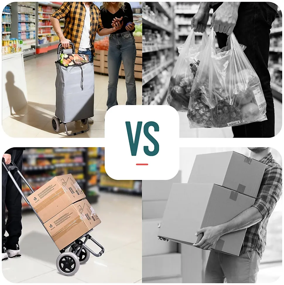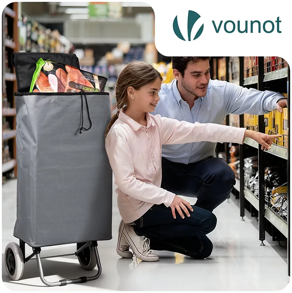 LES + PRODUITS Grande capacité Cadre en métal robuste Roues silencieuses et fluides Utilisation 2 en 1 DESCRIPTION Ce chariot de courses dispose d’un grand volume de 59 L, pratique pour les courses, les sorties au marché ou le transport d’objets du quotidien. La poche arrière zippée offre un rangement sûr et accessible pour téléphone, portefeuille, clés et petits essentiels. Sa structure en métal est à la fois légère et solide, pour une utilisation fiable au quotidien. Même bien chargé, le chariot reste stable et facile à manier. Le sac en tissu Oxford est résistant à la déchirure, conçu pour durer et se nettoie facilement après usage. Le système à 2 roues de ce caddie assure une conduite souple et stable sur les surfaces irrégulières comme les bosses, fissures ou trottoirs. Les roues résistantes limitent l’usure et roulent de manière discrète pour un confort d’utilisation au quotidien. Avec son sac, il fonctionne comme un chariot de courses classique. Sans le sac, le plateau rigide le transforme en diable, idéal pour empiler et déplacer facilement cartons, caisses, bouteilles d’eau et autres objets. Grâce à sa conception pliable et à son sac de rangement amovible, ce chariot se replie en quelques gestes. Une fois plié, il prend très peu de place et se range facilement dans un coin, un placard ou dans le coffre de la voiture, pratique quand on manque d’espace. CARACTÉRISTIQUE Matériau : Métal ; Oxford Dimensions : 38 x 28 x 93 cm Poids : 2kg Couleurs disponibles : Gris ; Noir ; Bleu marine